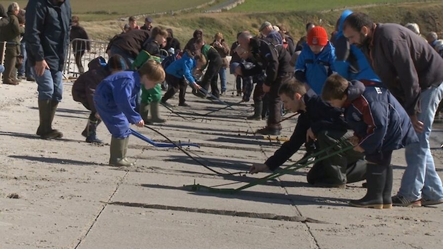 The boys compete in a match at the Sands O' Wright - a vast beach just outside the village. They use their miniature ploughs to draw lines in the sand, learning the craft of the finely tilled furrow.