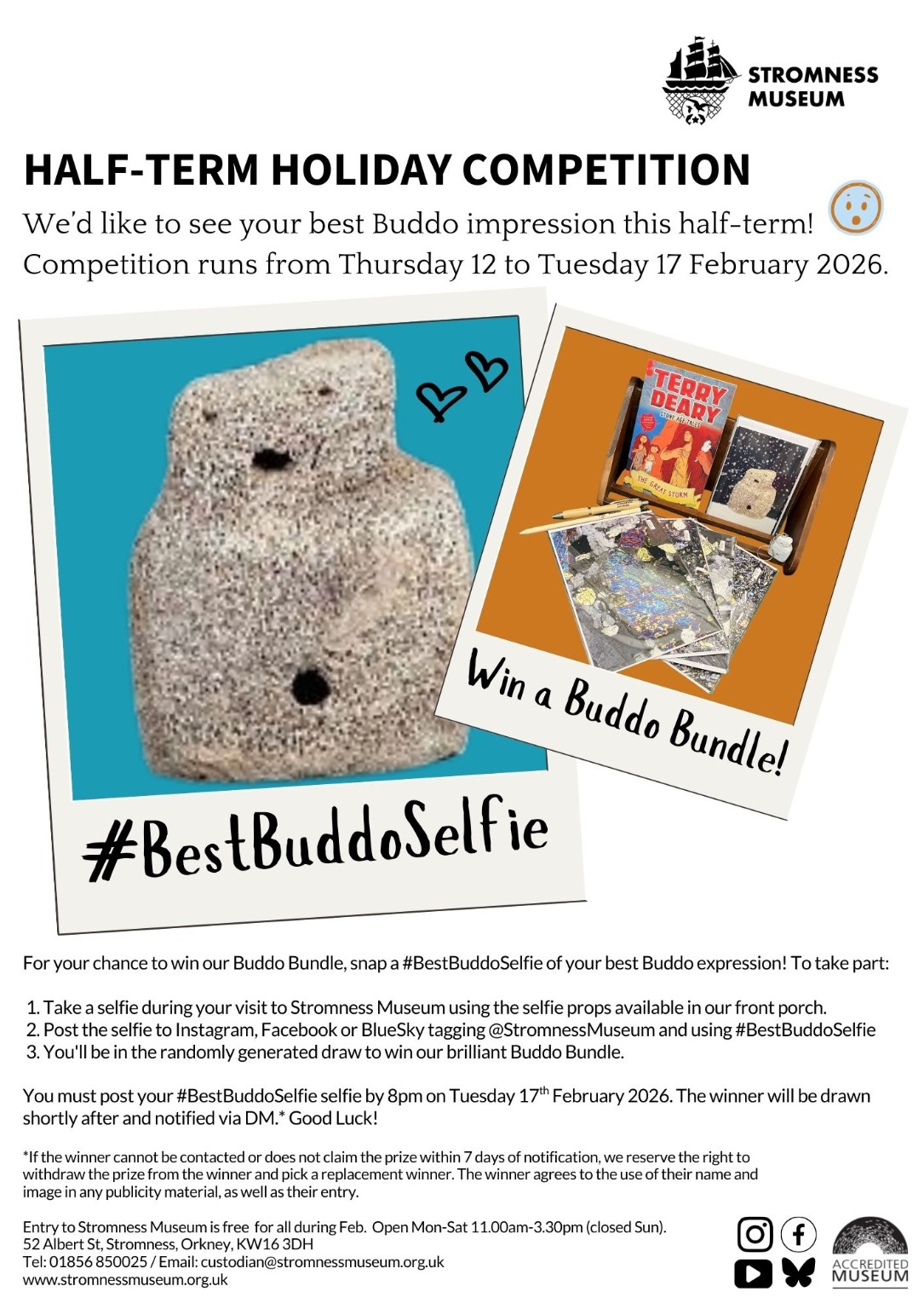 2. Post the selfie to Instagram, Facebook or BlueSky tagging @StromnessMuseum and using #BestBuddoSelfie