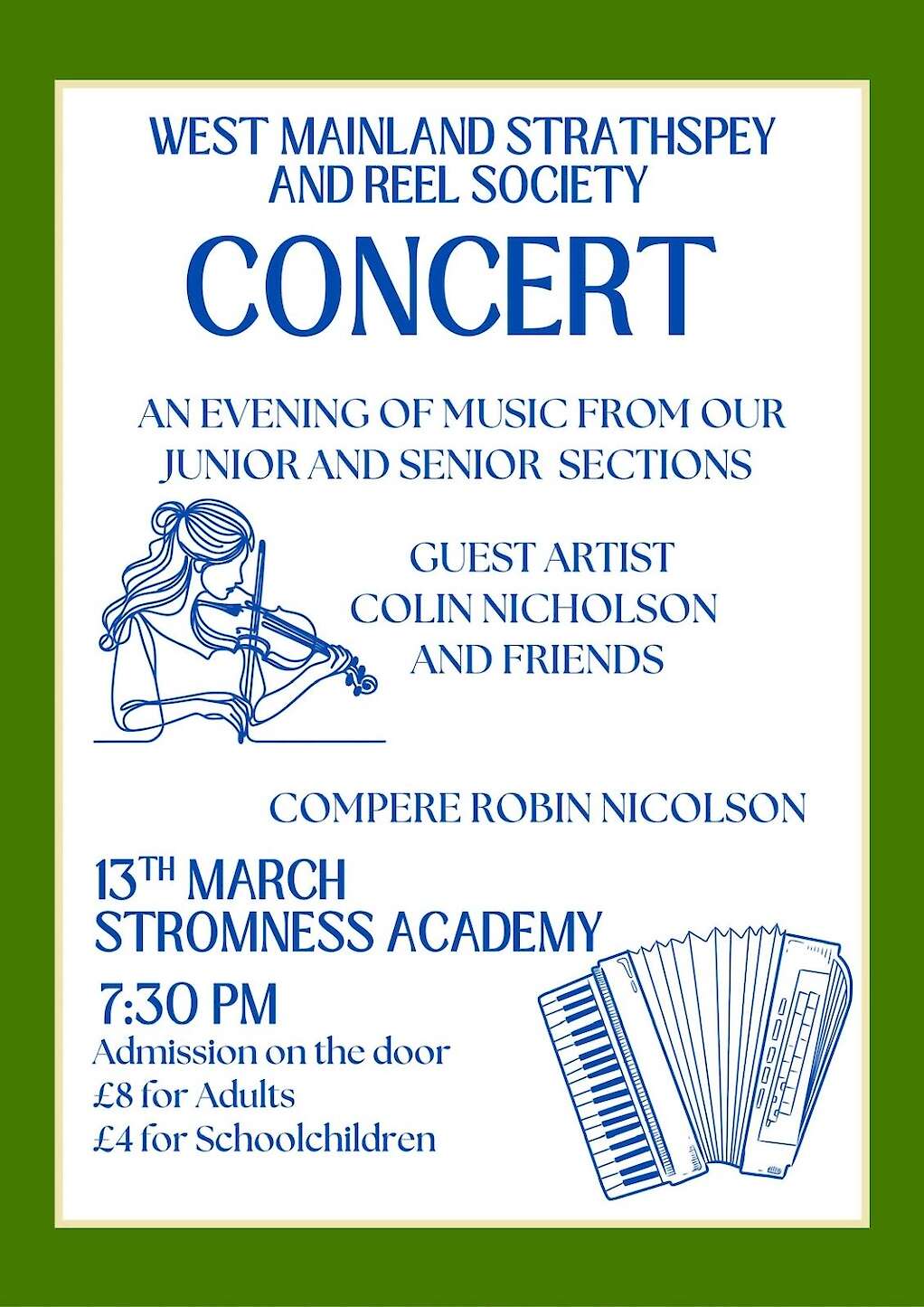 Sit back and enjoy a fabulous concert with members of the West Mainland Strathspey and Reel Society in Stromness Academy.