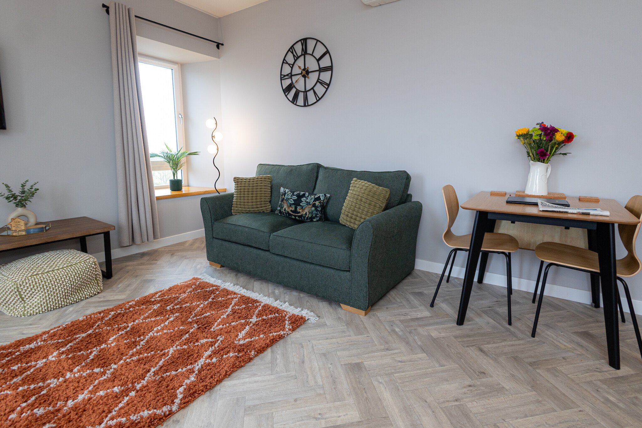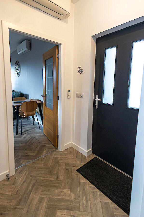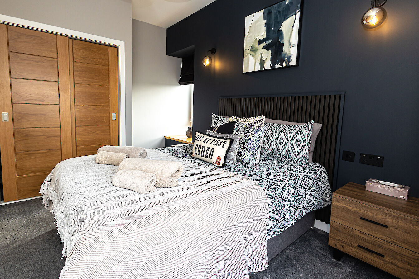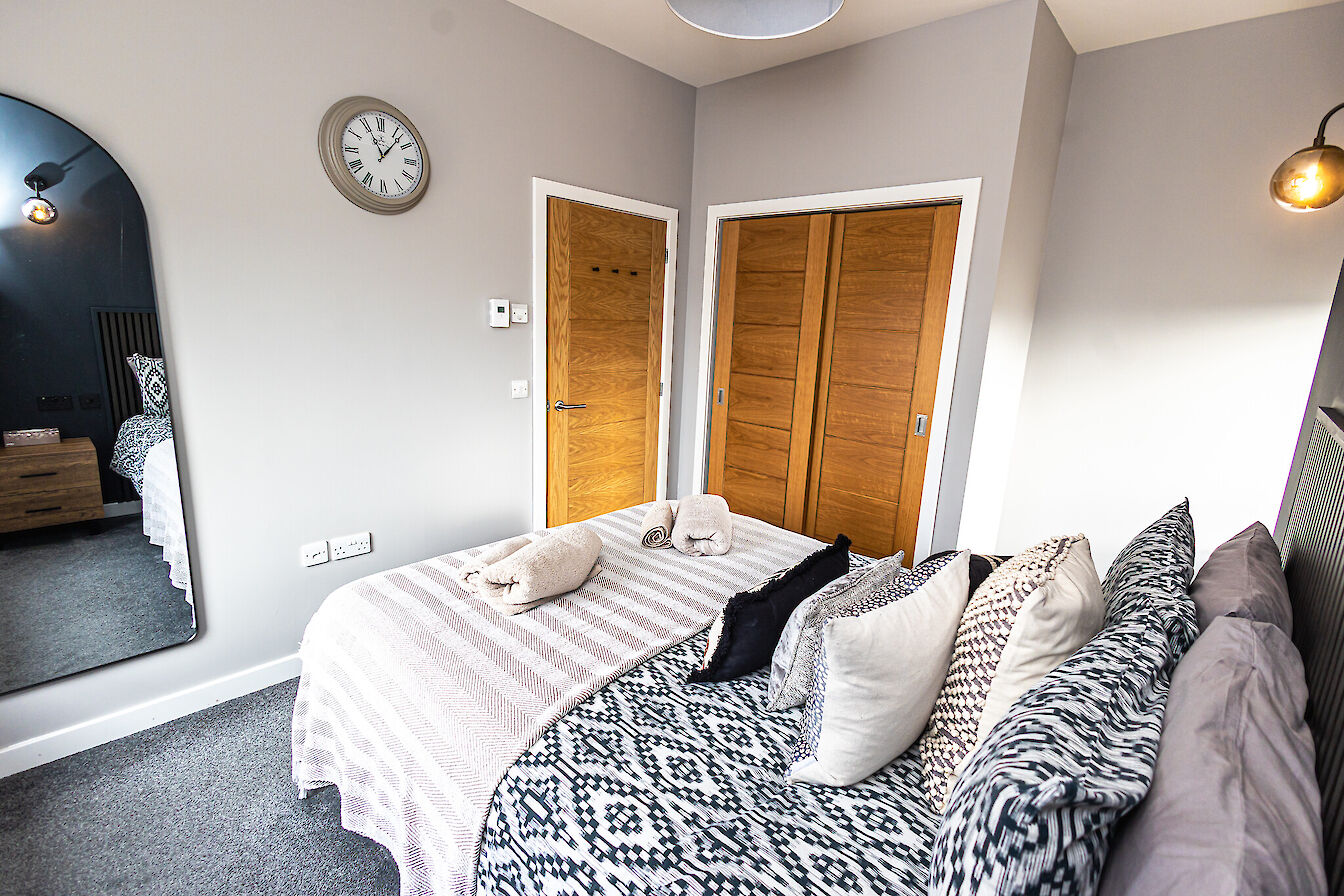 The flat features an open plan living area with comfortable seating, a dining space for 4 and a well equipped kitchen. The bedroom is calm and inviting with a comfortable bed and ample storage. A sleek, contemporary bathroom completes the space.