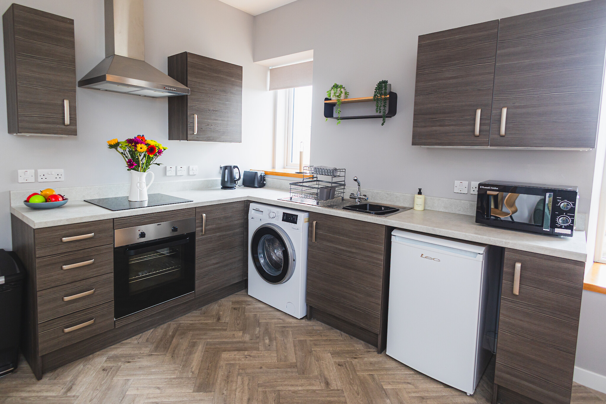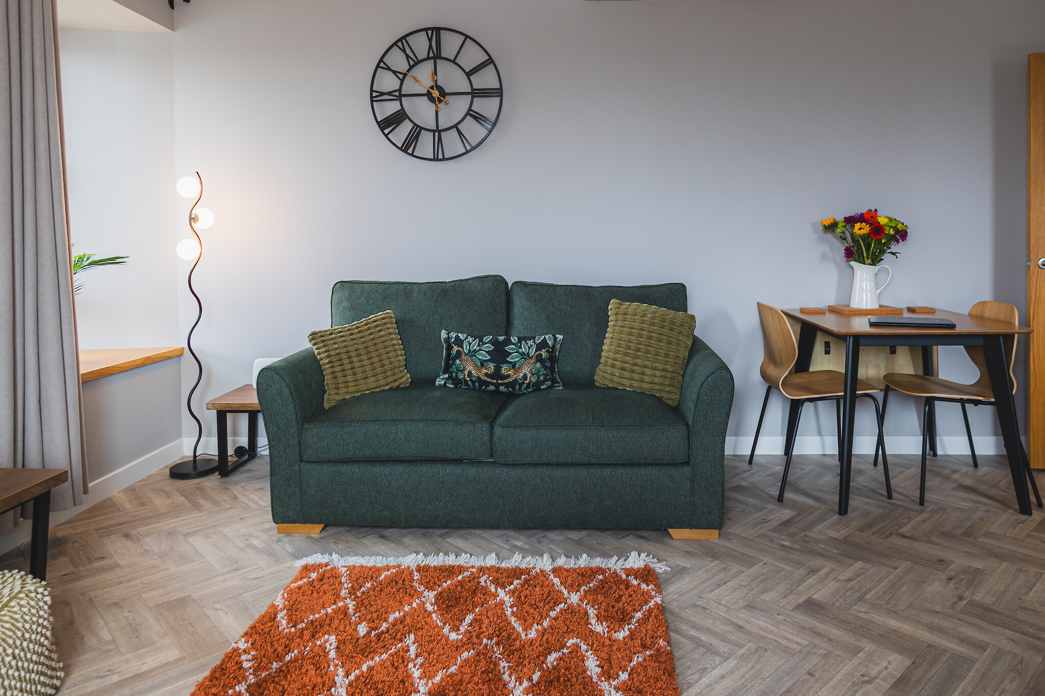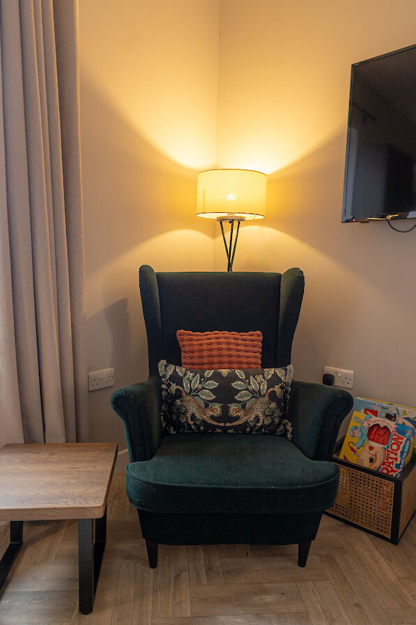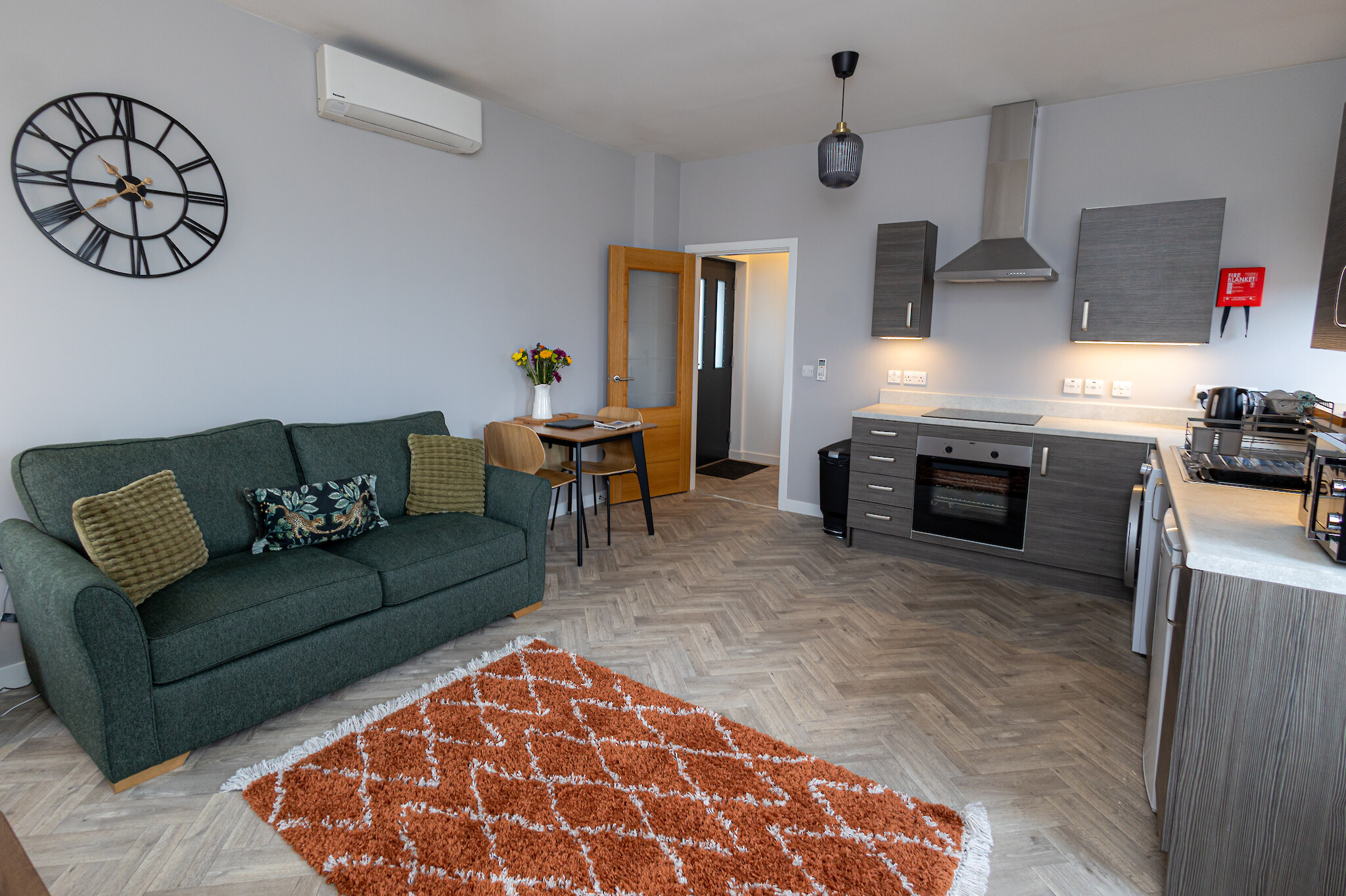 The flat features an open plan living area with comfortable seating, a dining space for 4 and a well equipped kitchen. The bedroom is calm and inviting with a comfortable bed and ample storage. A sleek, contemporary bathroom completes the space.