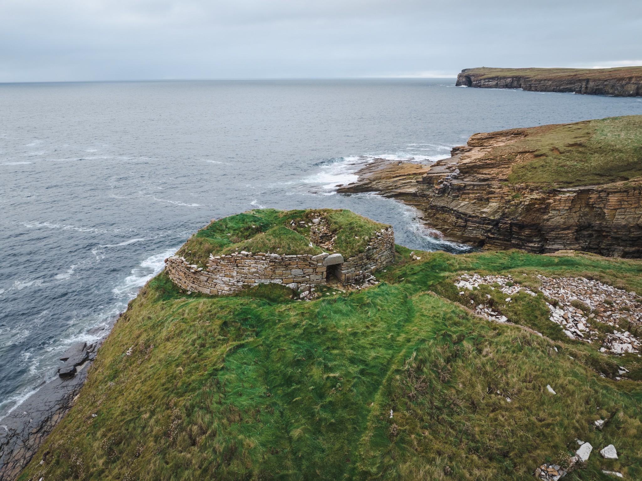 This ancient broch is found perched on a crumbling headland just north of the cliffs at Yesnaby.