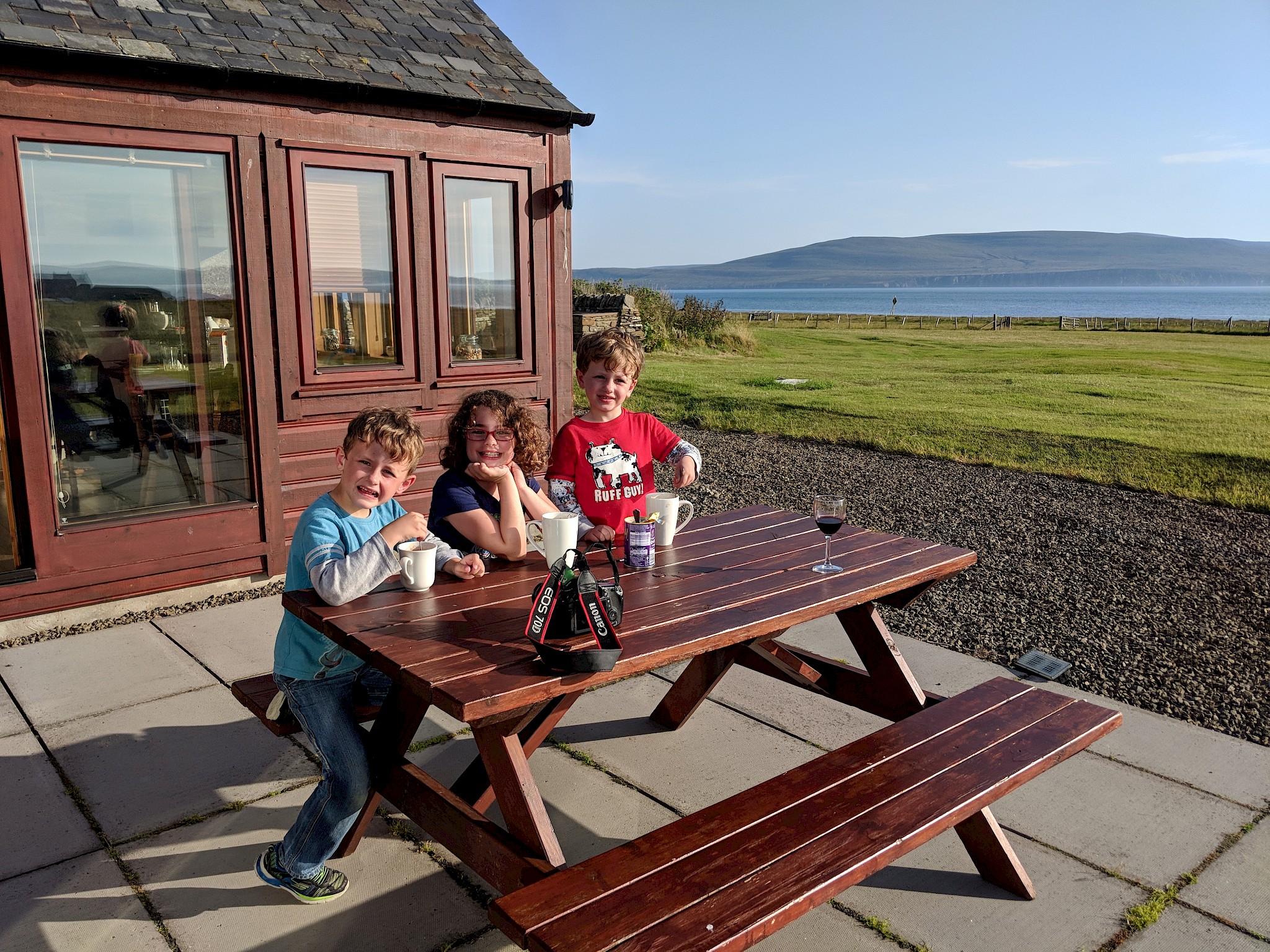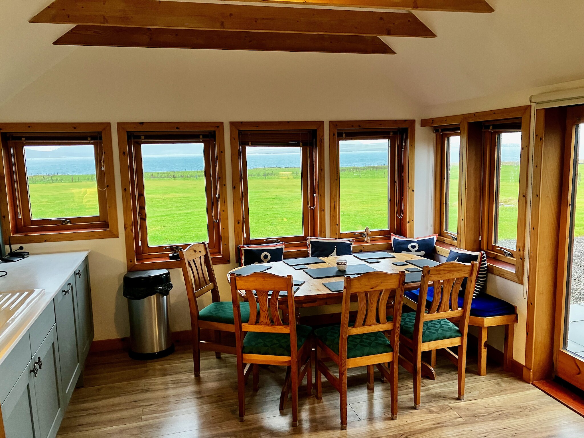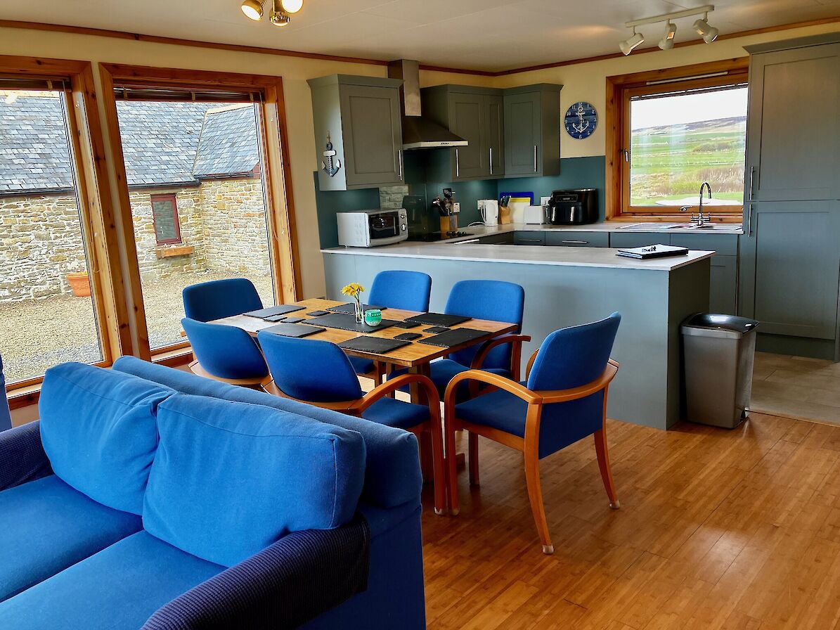 Buxa Croft House is a sympathetically renovated derelict house with natural wood extension. Underfloor heating beneath original slate floors ensures that the house is always cosy. Energy efficient solar panel guarantees hot water on demand. Accommodation spread over one floor includes an entrance vestibule with built in seated bench and ample coat hooks for outdoor gear. A stunning lounge and dining room with multi-fuel stove and large screen television with Freeview and Blu-ray player. There is an adjoining double bedroom with multi-fuel stove and ensuite shower room. The spacious eat-in kitchen has built in window seats to enjoy the glorious view of the sea and hills of the neighboring island of Hoy. The kitchen incorporates a variety of quality integrated appliances including a Ninja airfryer and an additional television with built in DVD player. Large patio doors from the kitchen lead out to a paved patio area with large picnic table for “al fresco dining” while enjoying the glorious sunsets over Scapa Flow and Stromness. There are two more bedrooms both benefiting from built-in wardrobes. The “kids” room has two bunk beds sleeping four with an additional cot available. The master has a double bed that looks out to Scapa Flow through large patio doors leading to the paved patio. The modern family bath is fully fitted including shower over bath. Sleeps 2-8 people comfortably. Linens and towels included.