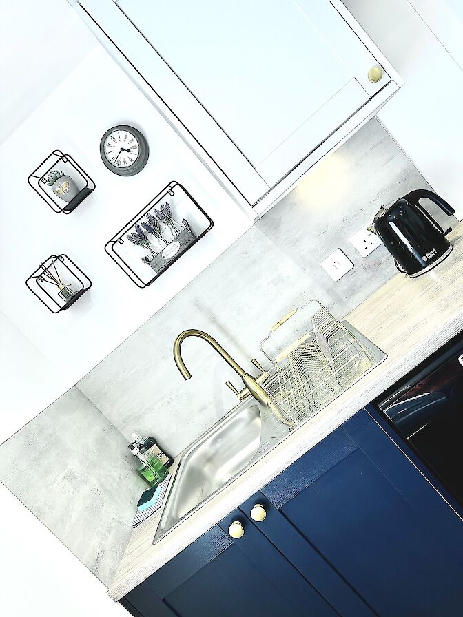 The heart of the home is our stunning blue and light grey kitchen, fully equipped with all the essentials for your culinary endeavors. Prepare delicious meals or simply enjoy a cup of tea while basking in the soothing ambiance.