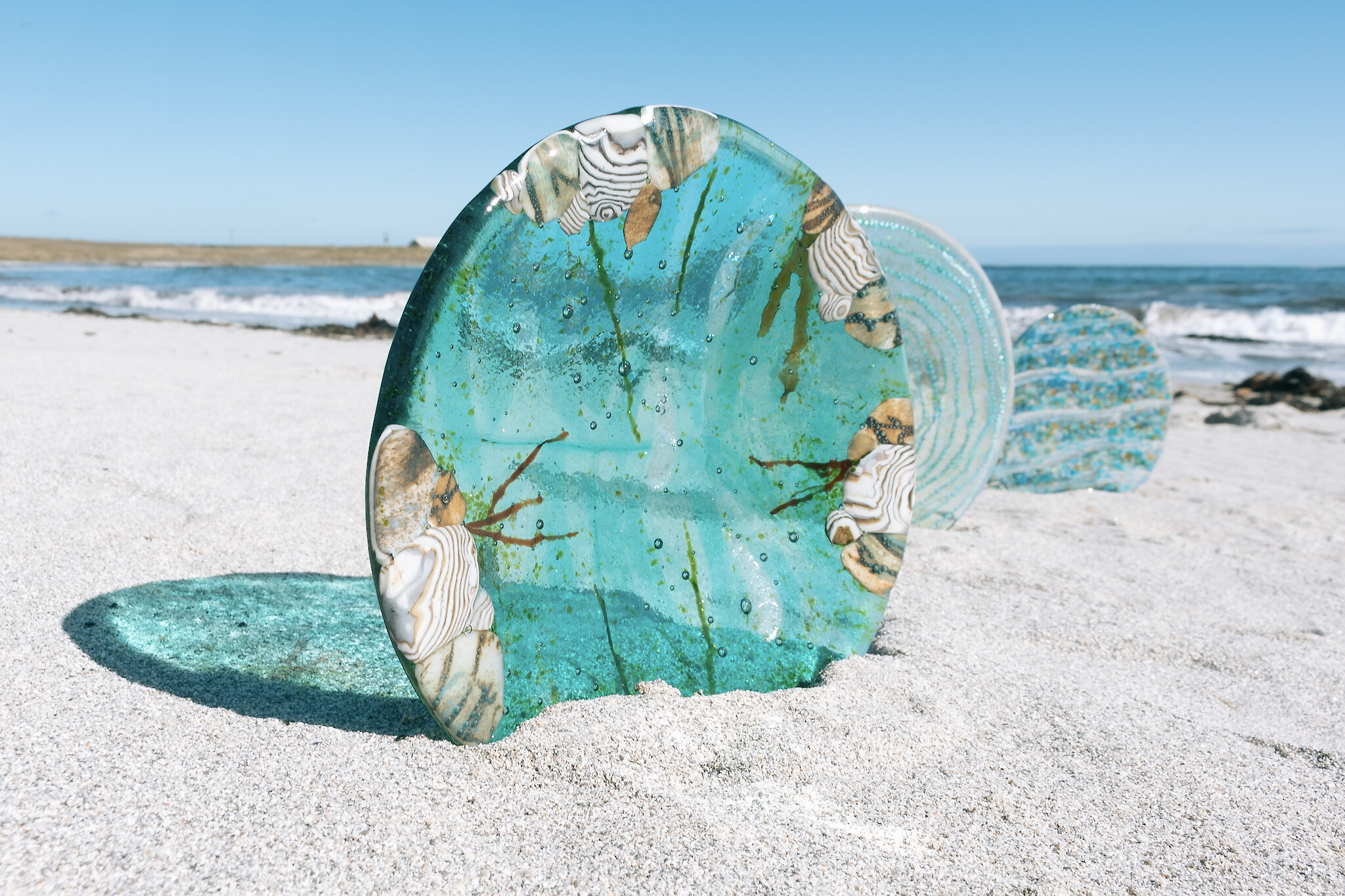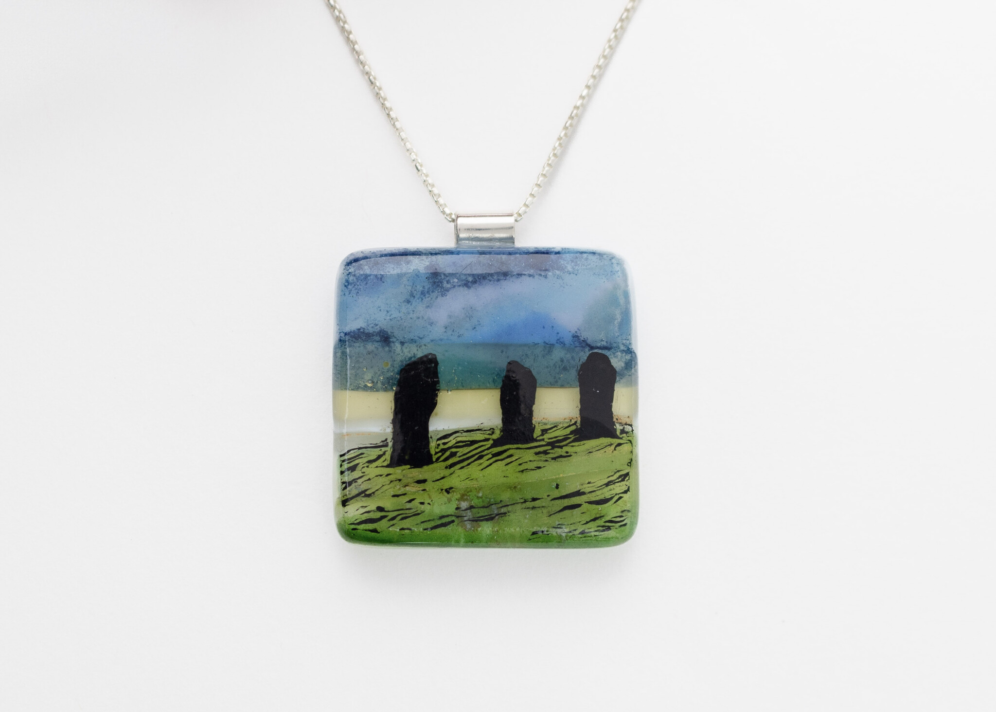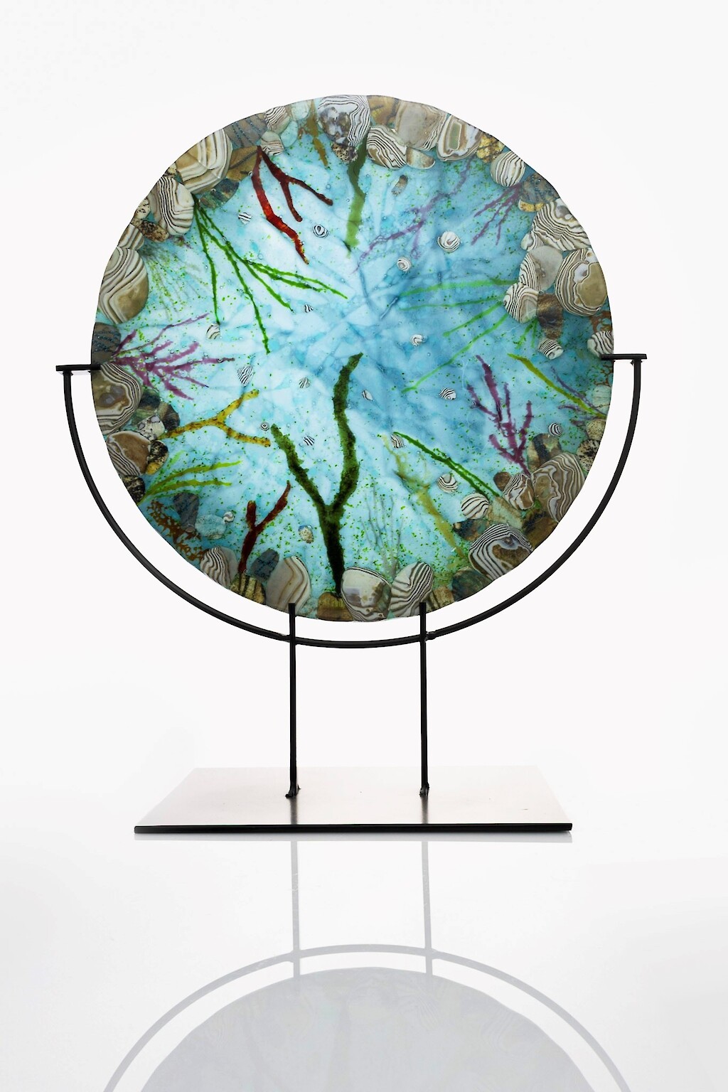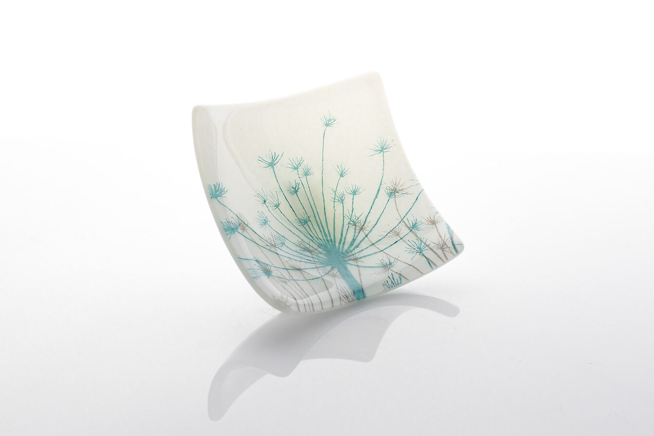 All my work is designed, assembled, and fired in my kilns at my home studio in Deerness, Orkney. My glass art often involves multiple firings and a range of techniques and cold working, including developing my own drawings into screens to screen print in enamel between the layers of glass, painting with enamels and powders, building intricate freeform designs from glass powder, and kiln-formed gravity drop vessels and jewellery.