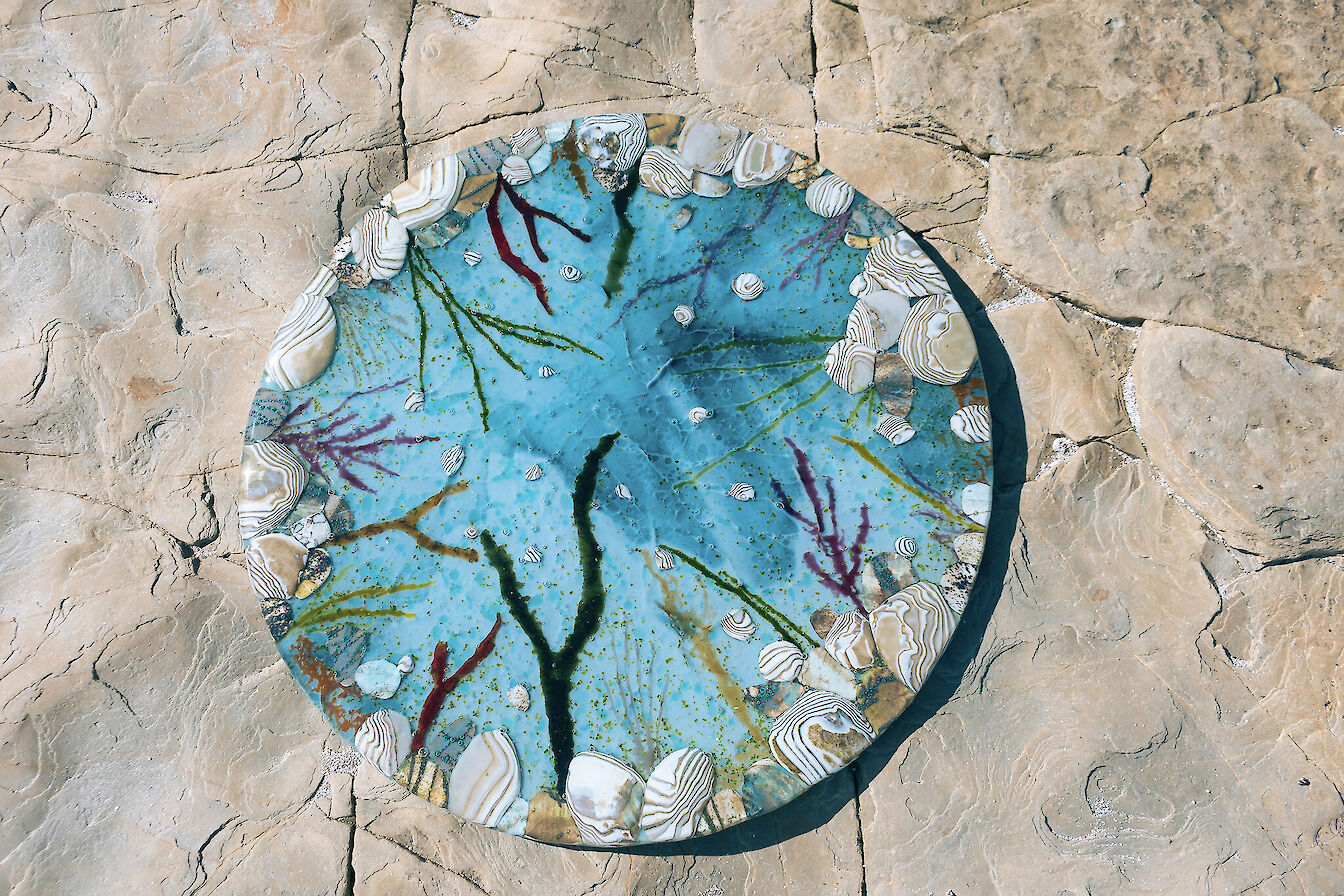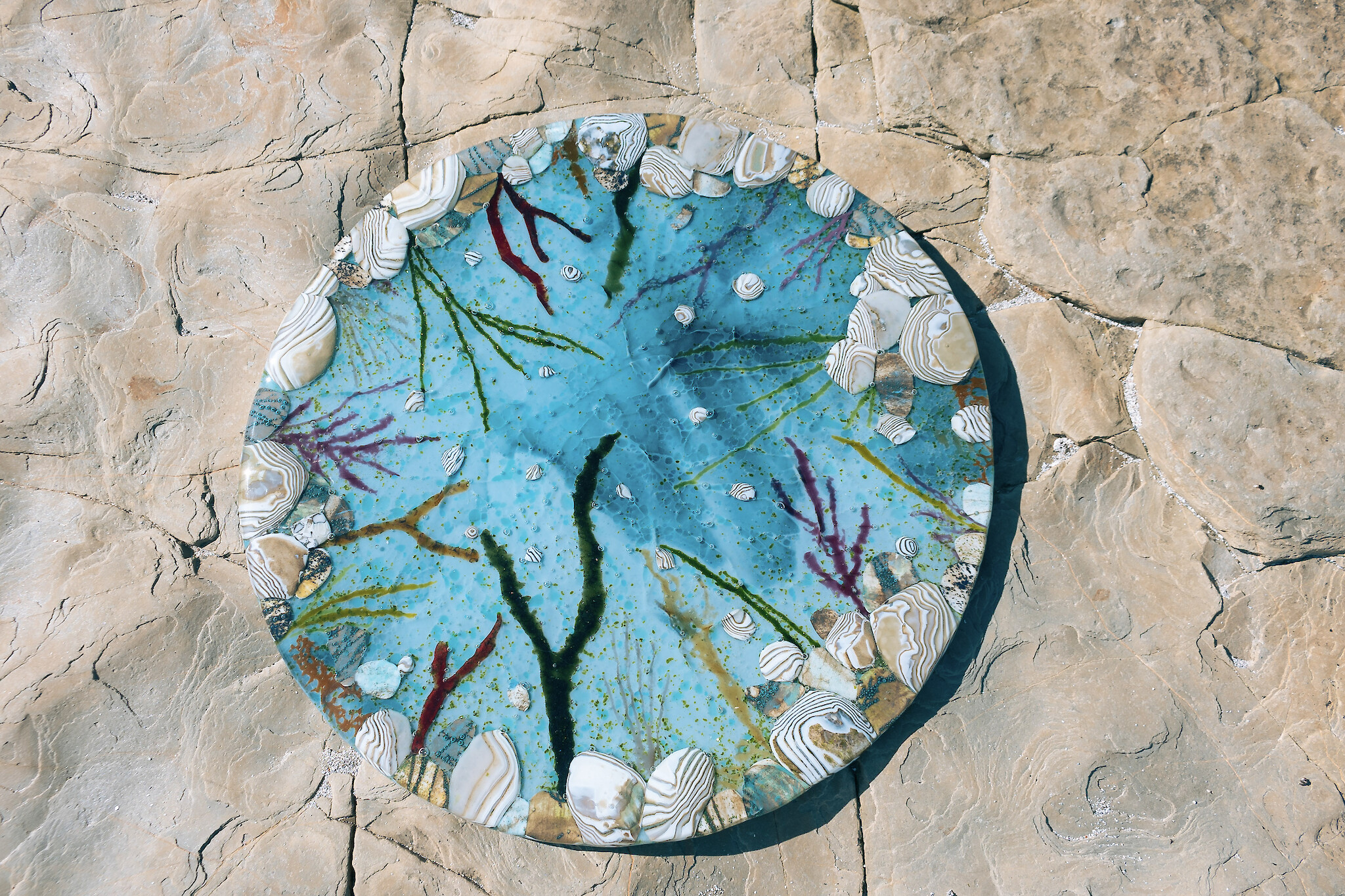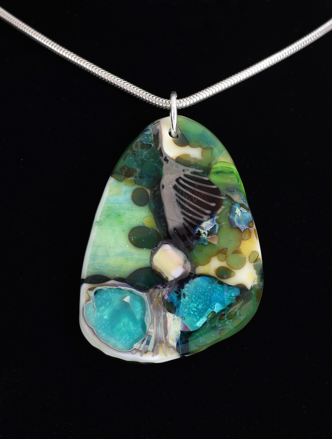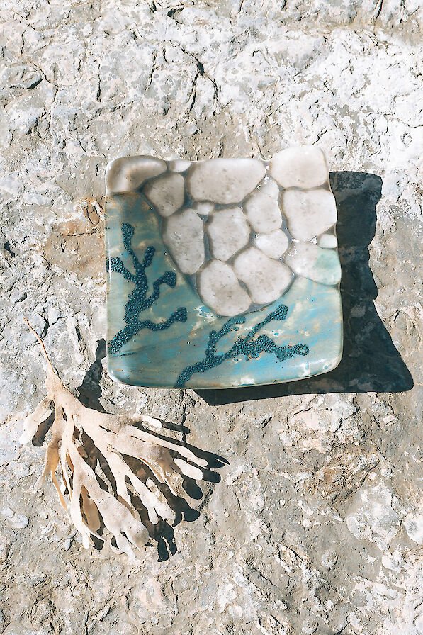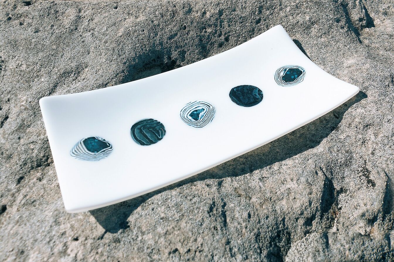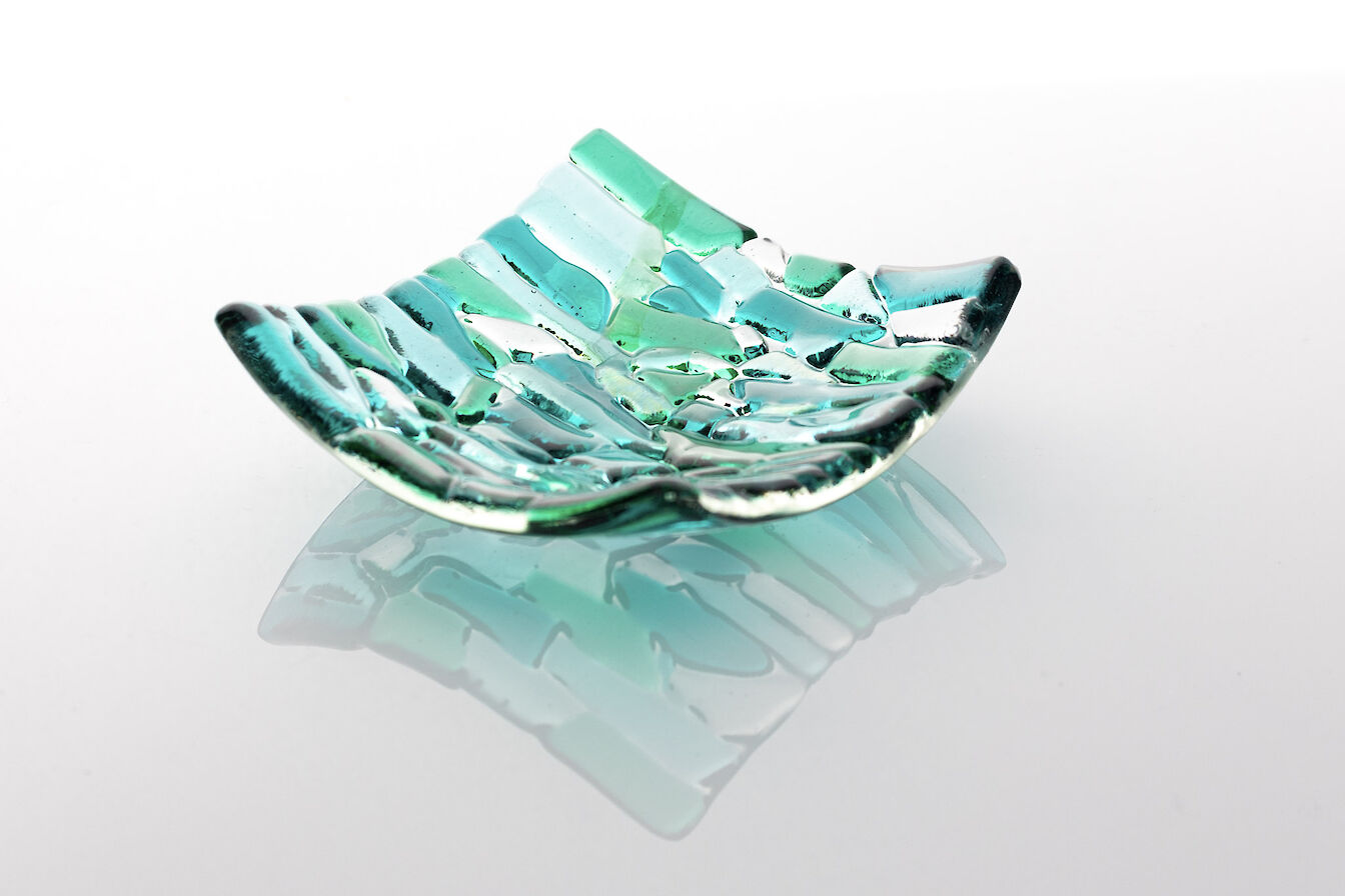 All my work is designed, assembled, and fired in my kilns at my home studio in Deerness, Orkney. My glass art often involves multiple firings and a range of techniques and cold working, including developing my own drawings into screens to screen print in enamel between the layers of glass, painting with enamels and powders, building intricate freeform designs from glass powder, and kiln-formed gravity drop vessels and jewellery.