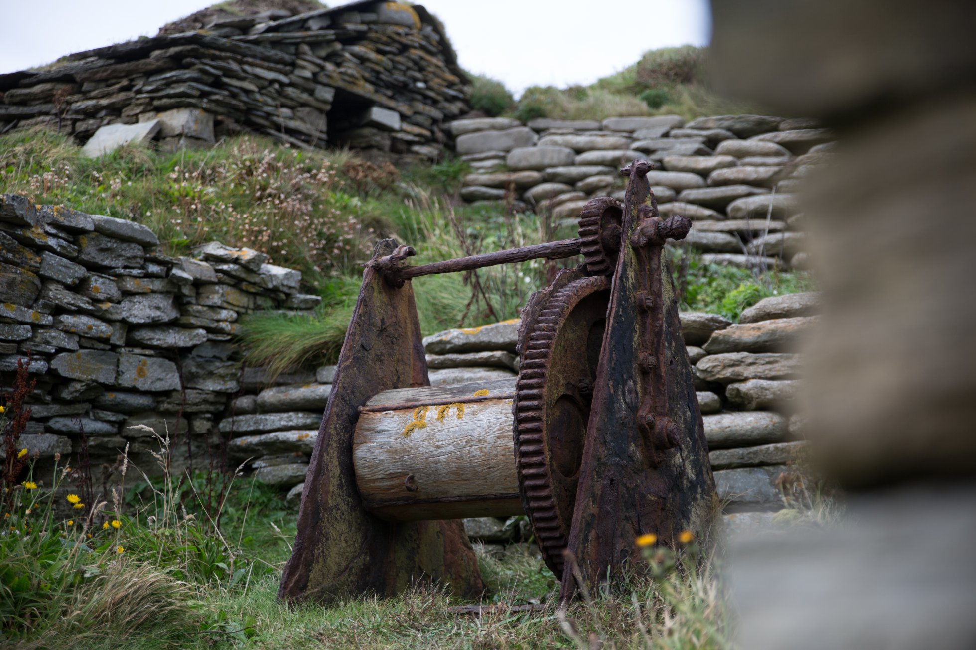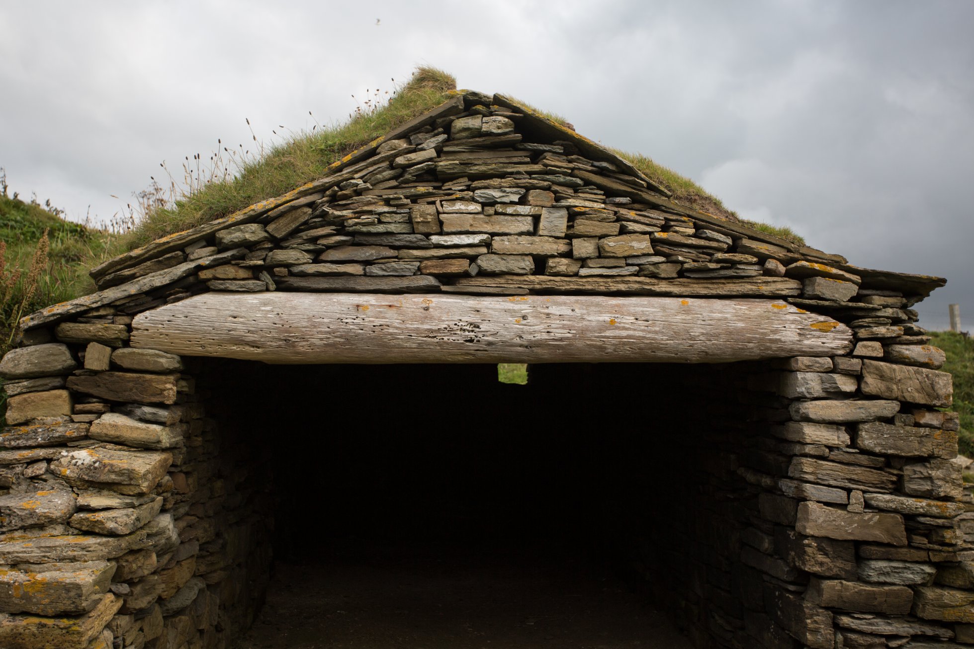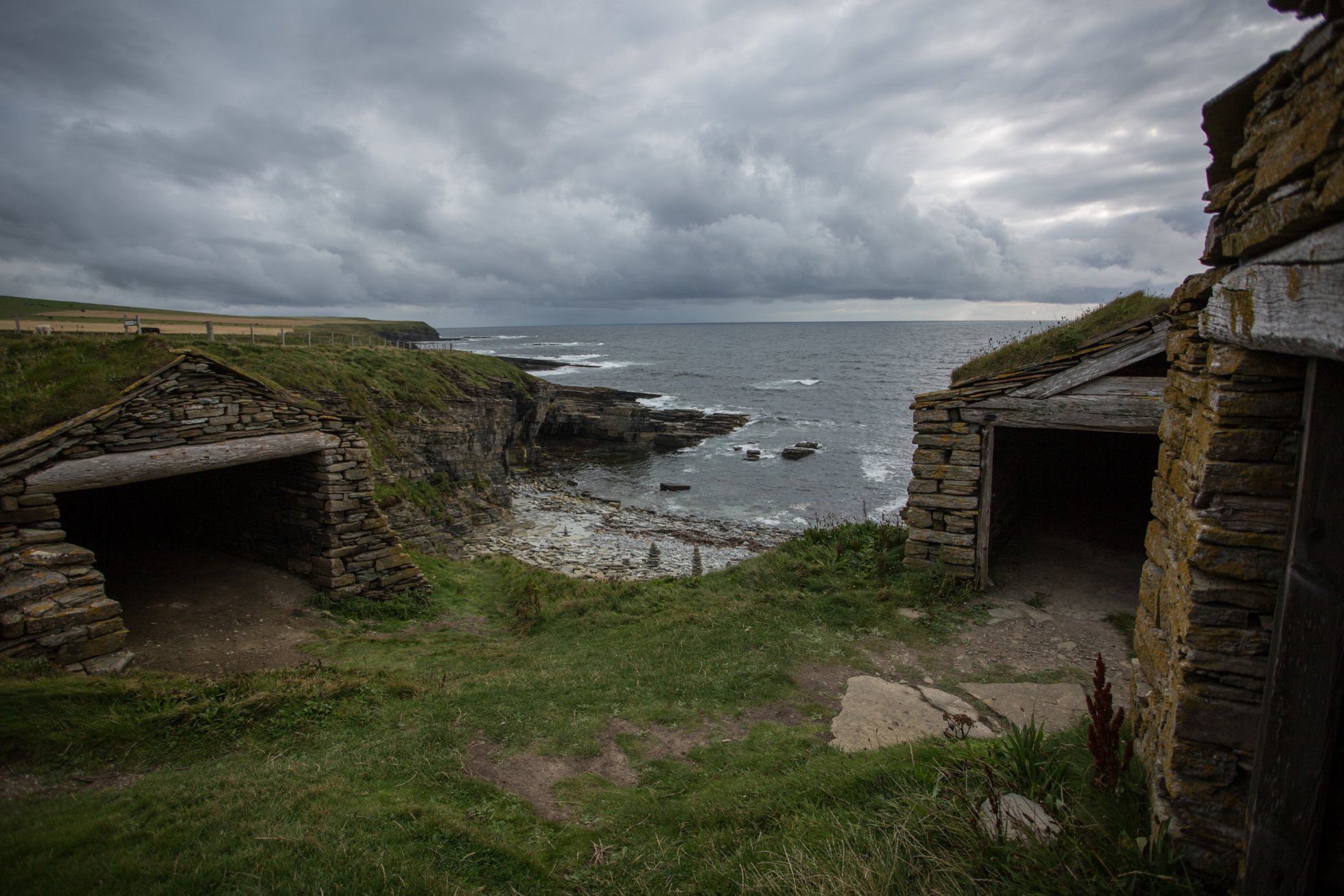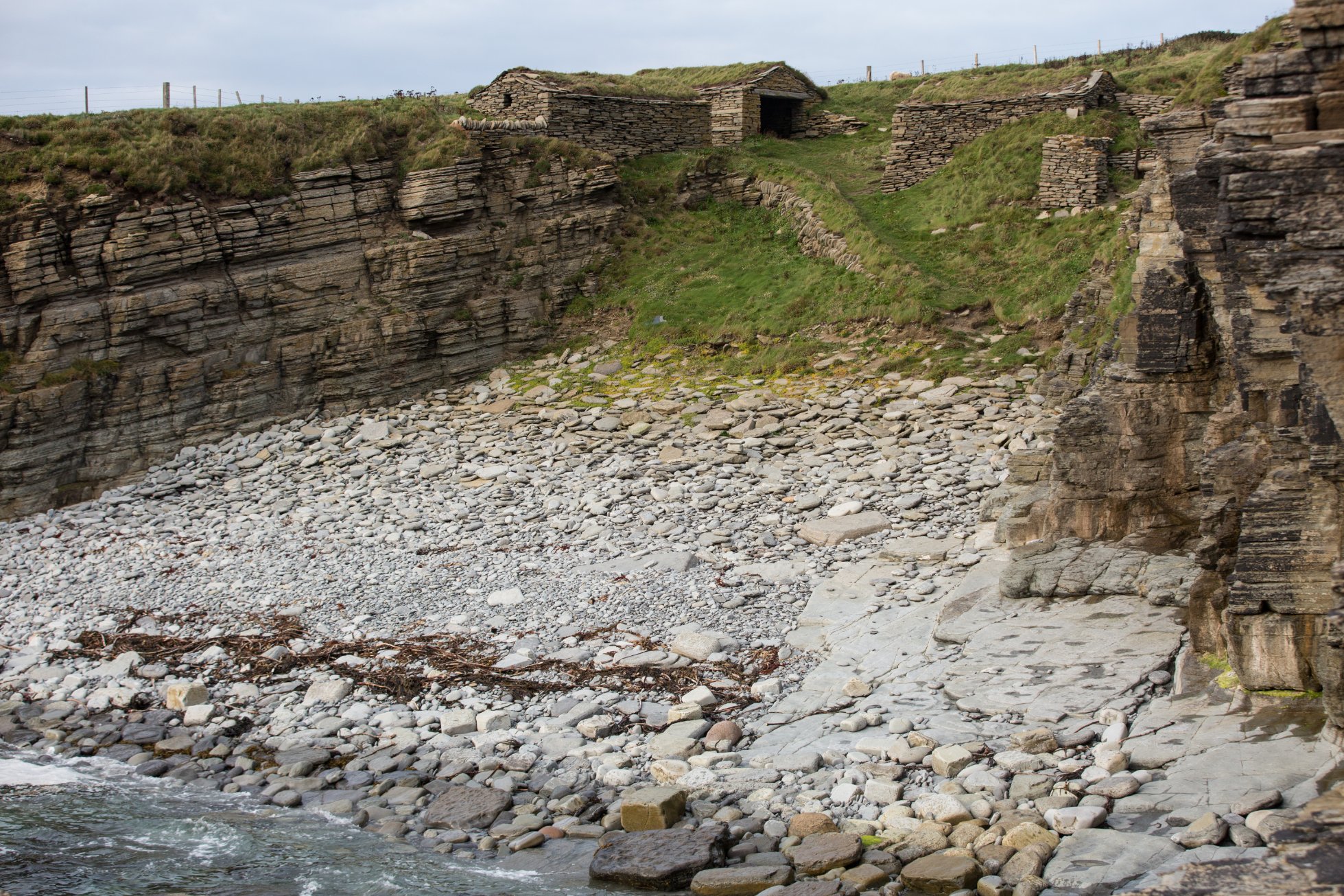 The parish of Birsay on the west coast of the Orkney mainland has a strong affinity with the sea. Along the coast from Marwick Bay you'll find Sand Geo, a stunning sheltered spot with a shallow bay. Perched up high above are three old stone huts, built to house boats and equipment, and to provide shelter to generations of Birsay fishermen.