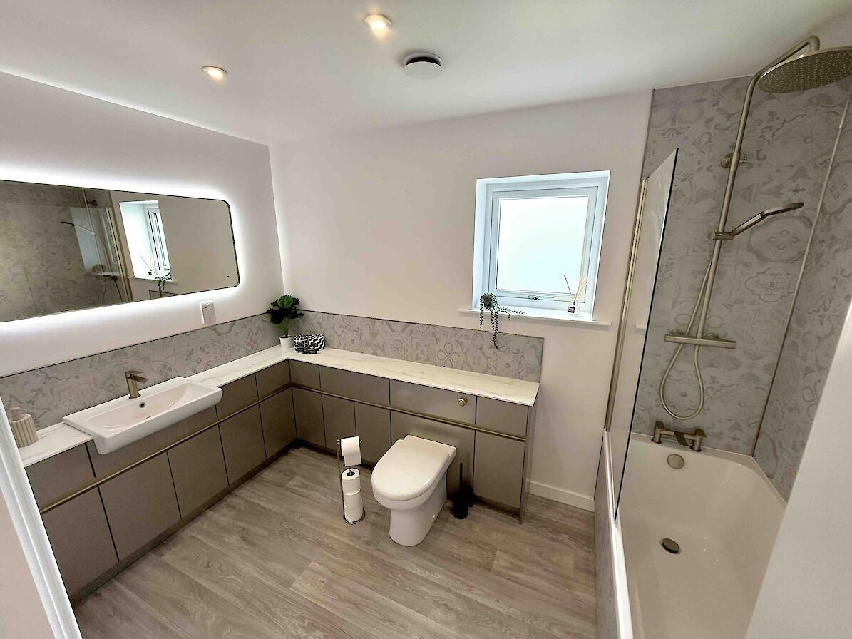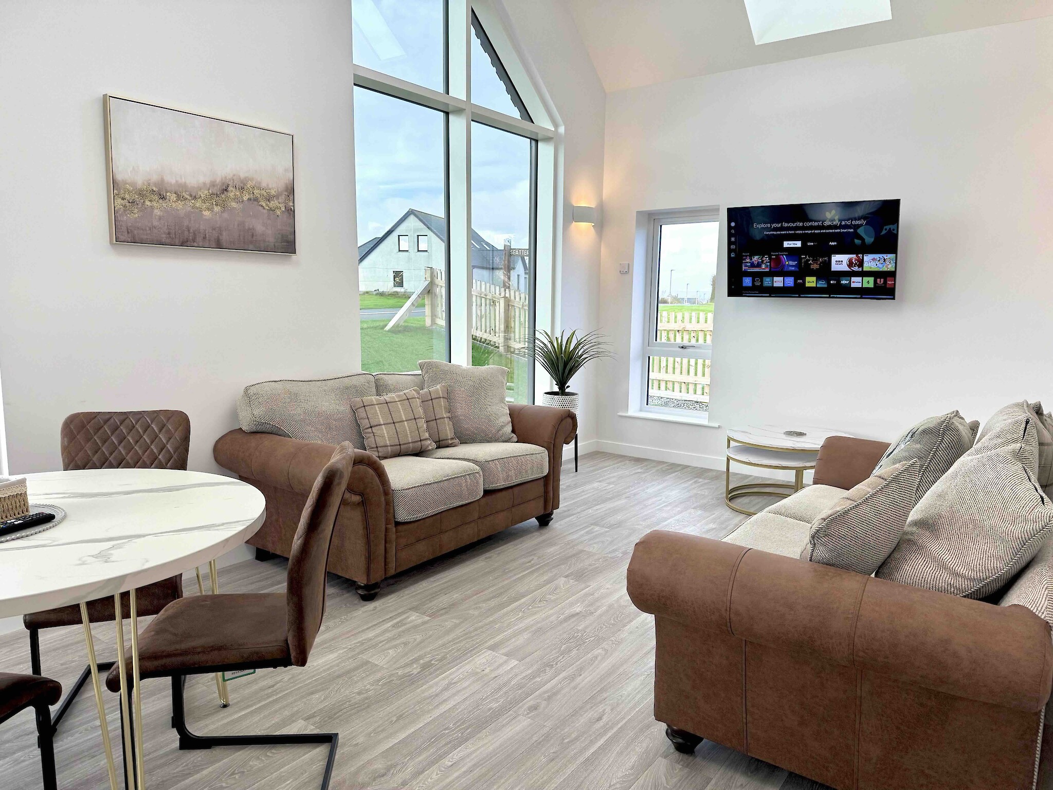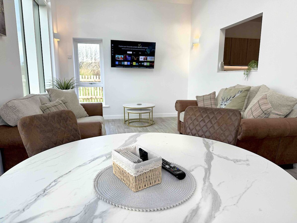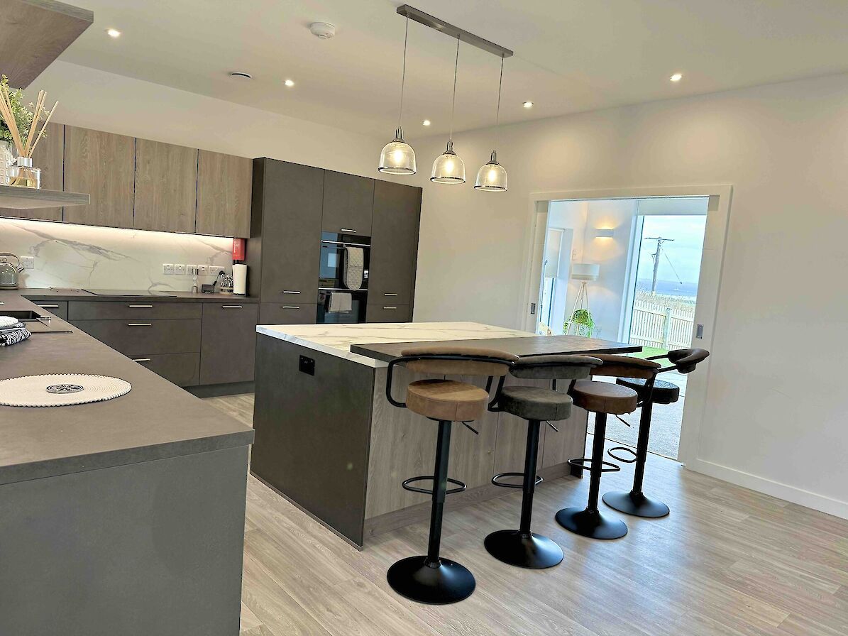 Modern design – the interiors are newly built and decorated, with a stylish kitchen, breakfast bar and smart TV in the open‑plan living area.