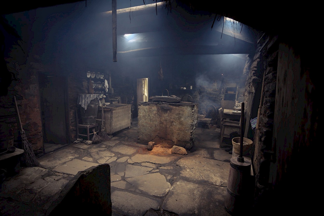 The farmhouse was occupied until the 1960s before being reopened as the musum in 1986. It's the last un-restored example of a traditional 'firehoose' in Northern Europe, with the house built around a central hearth and peat fire. There is also a stone neuk bed and a peat fire, with the rooms full of old household implements and furniture.