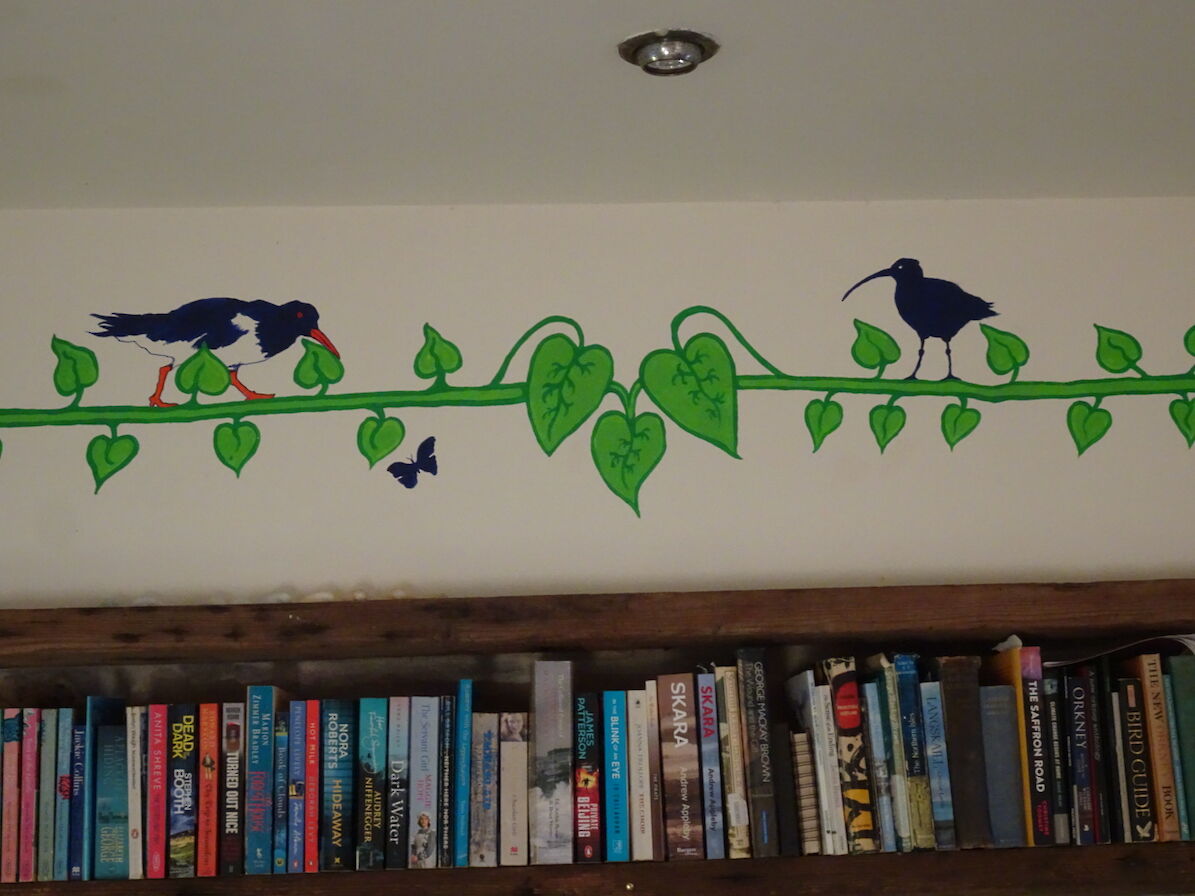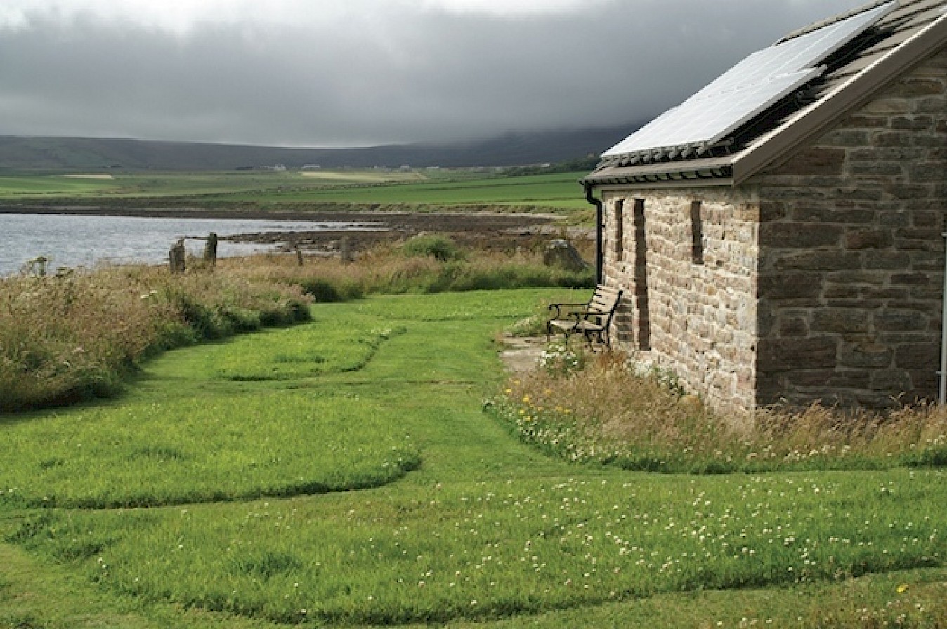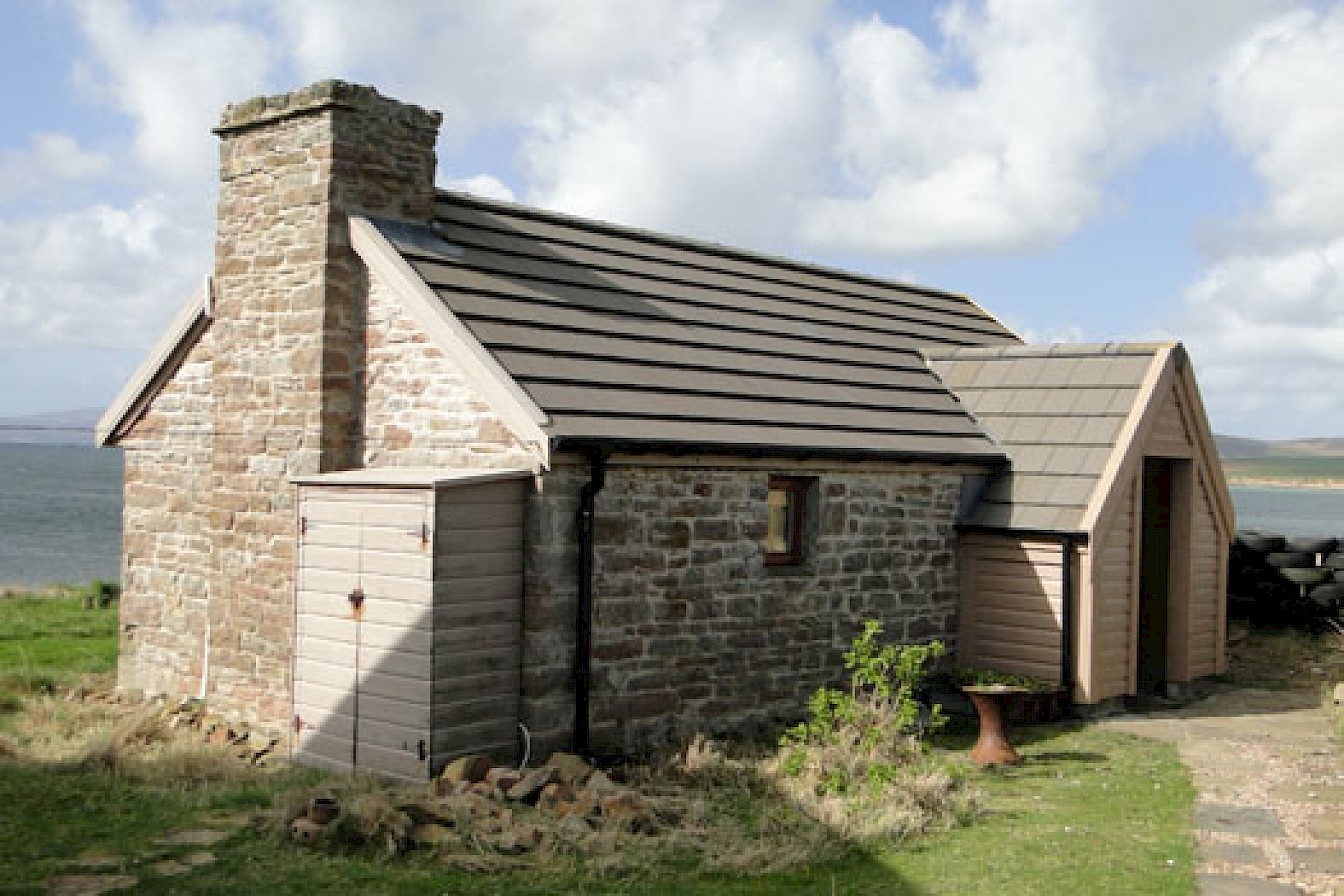 The seadoor opens onto a small lawned area and then there is the sea. The shore can be reached via a short steepish slope. Scapa Flow. Hoy, South Ronaldsay and other islands can be seen as well as some of our welcome guests of gannets, oystercatchers, wagtails, terns, widgeon, otters and the occasional minke whale or harbour porpoises. Many other birds and creatures visit, too many to list. To say nothing about watching the water in all its guises from flat calm to spectacular white topped waves. Or seeing a clear blue sky or one full of fantastic cloud formations. It is very easy to sit and while away the hours watching the panorama outside.