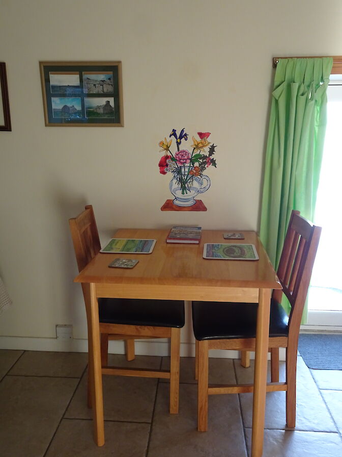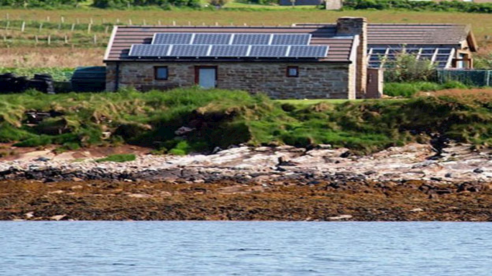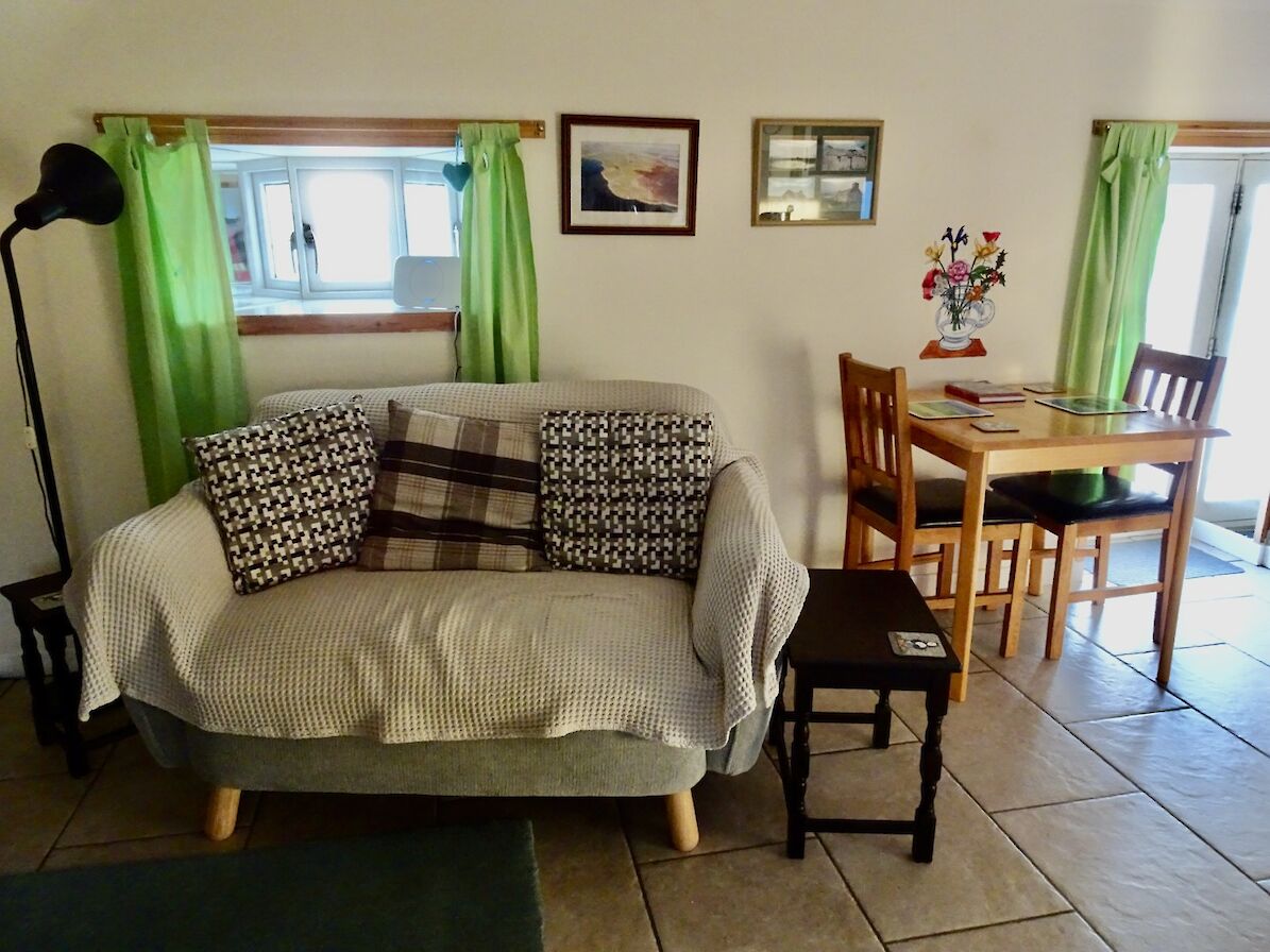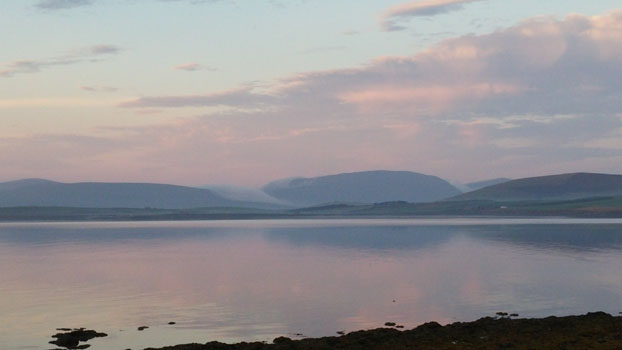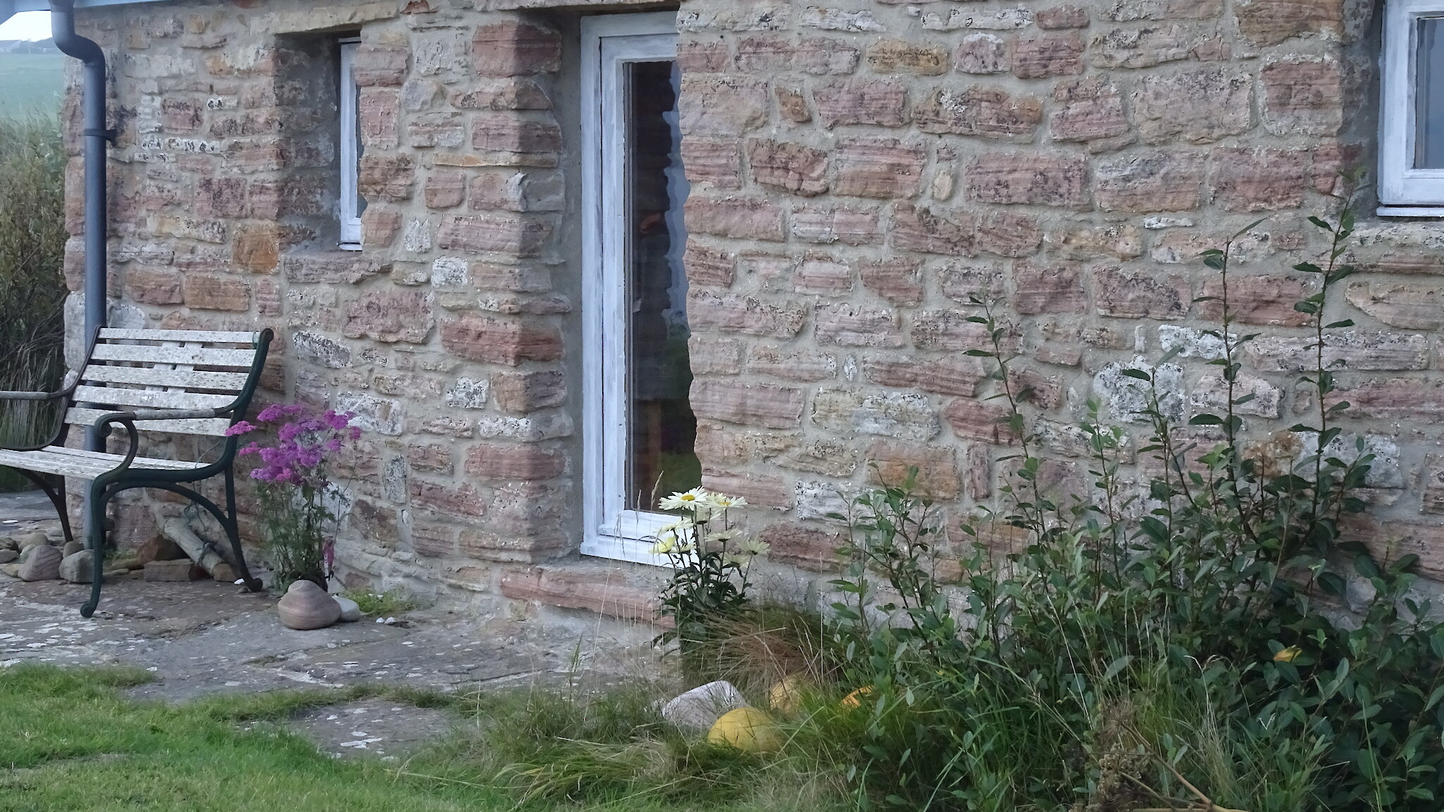 The seadoor opens onto a small lawned area and then there is the sea. The shore can be reached via a short steepish slope. Scapa Flow. Hoy, South Ronaldsay and other islands can be seen as well as some of our welcome guests of gannets, oystercatchers, wagtails, terns, widgeon, otters and the occasional minke whale or harbour porpoises. Many other birds and creatures visit, too many to list. To say nothing about watching the water in all its guises from flat calm to spectacular white topped waves. Or seeing a clear blue sky or one full of fantastic cloud formations. It is very easy to sit and while away the hours watching the panorama outside.