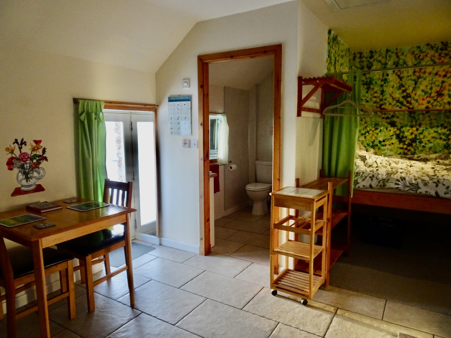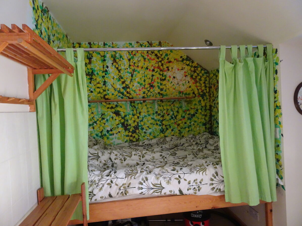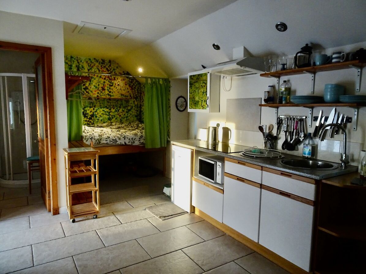 Inside the cottage is cosy with its woodburning stove, galley kitchen a comfortable box type bed enclosed on 3 sides. There is a television with DVD player, lots of books and a few games.