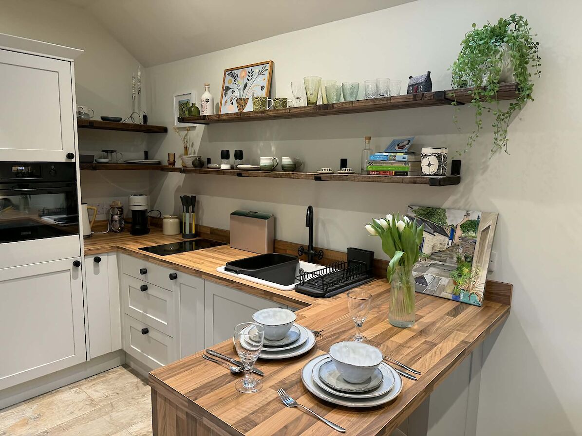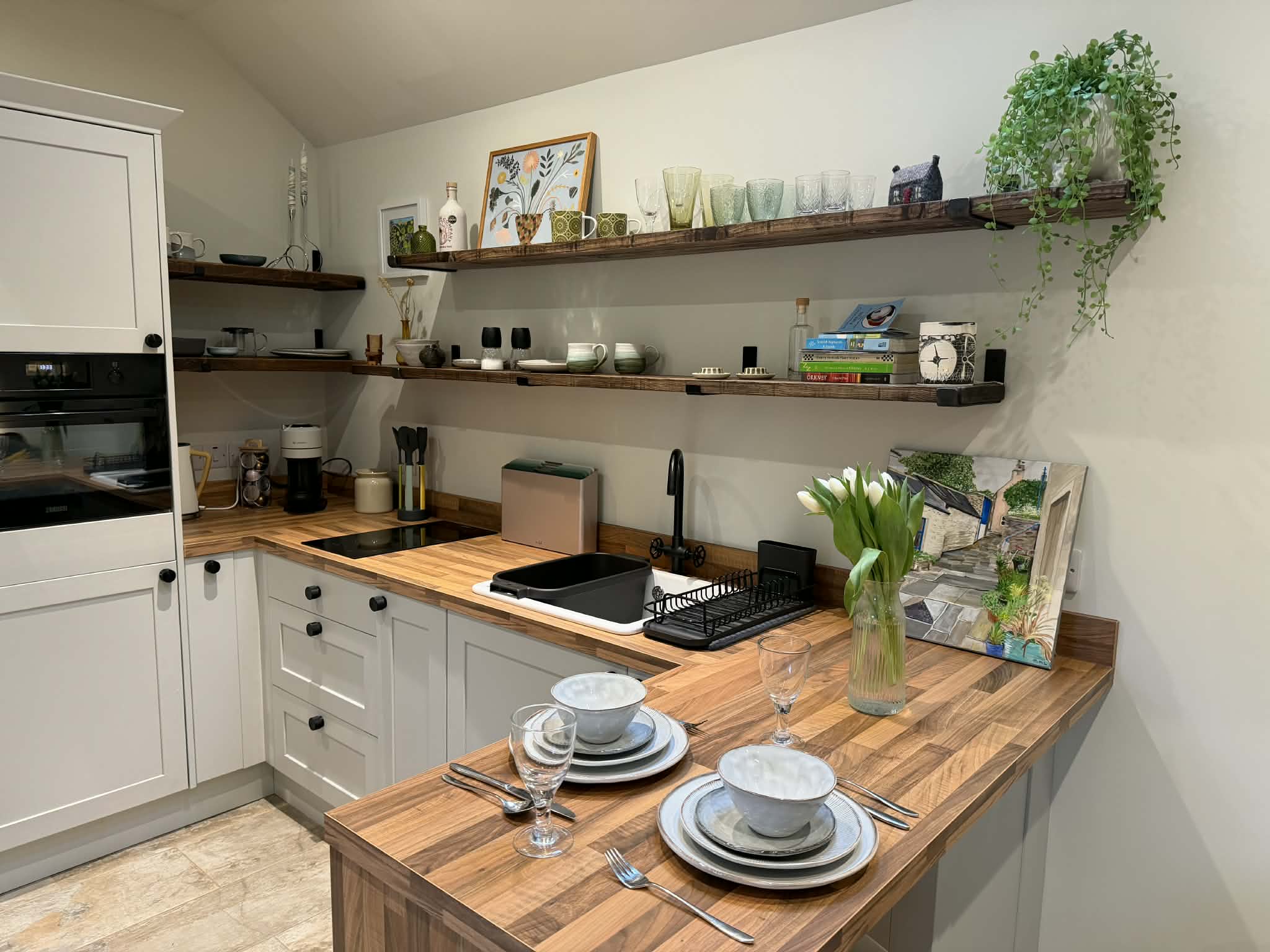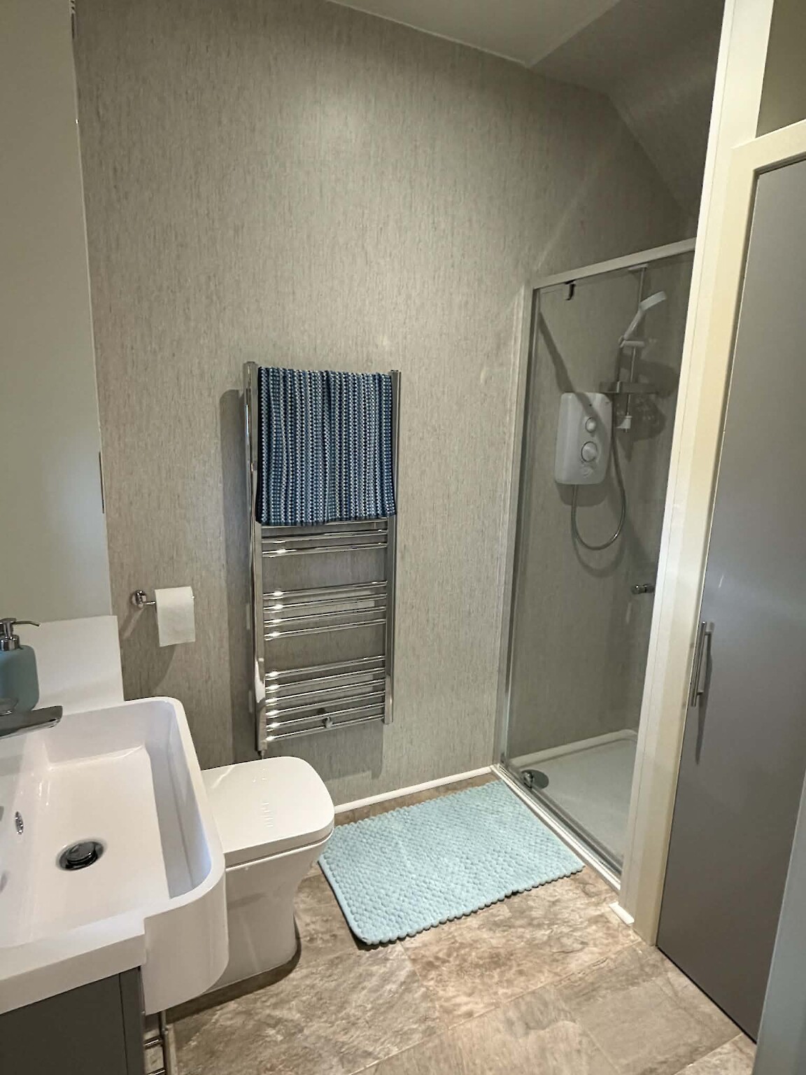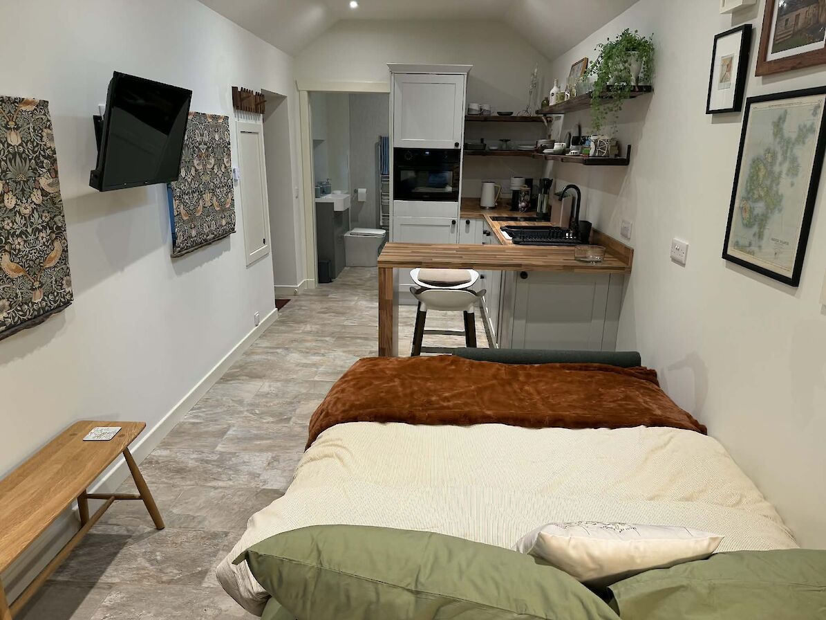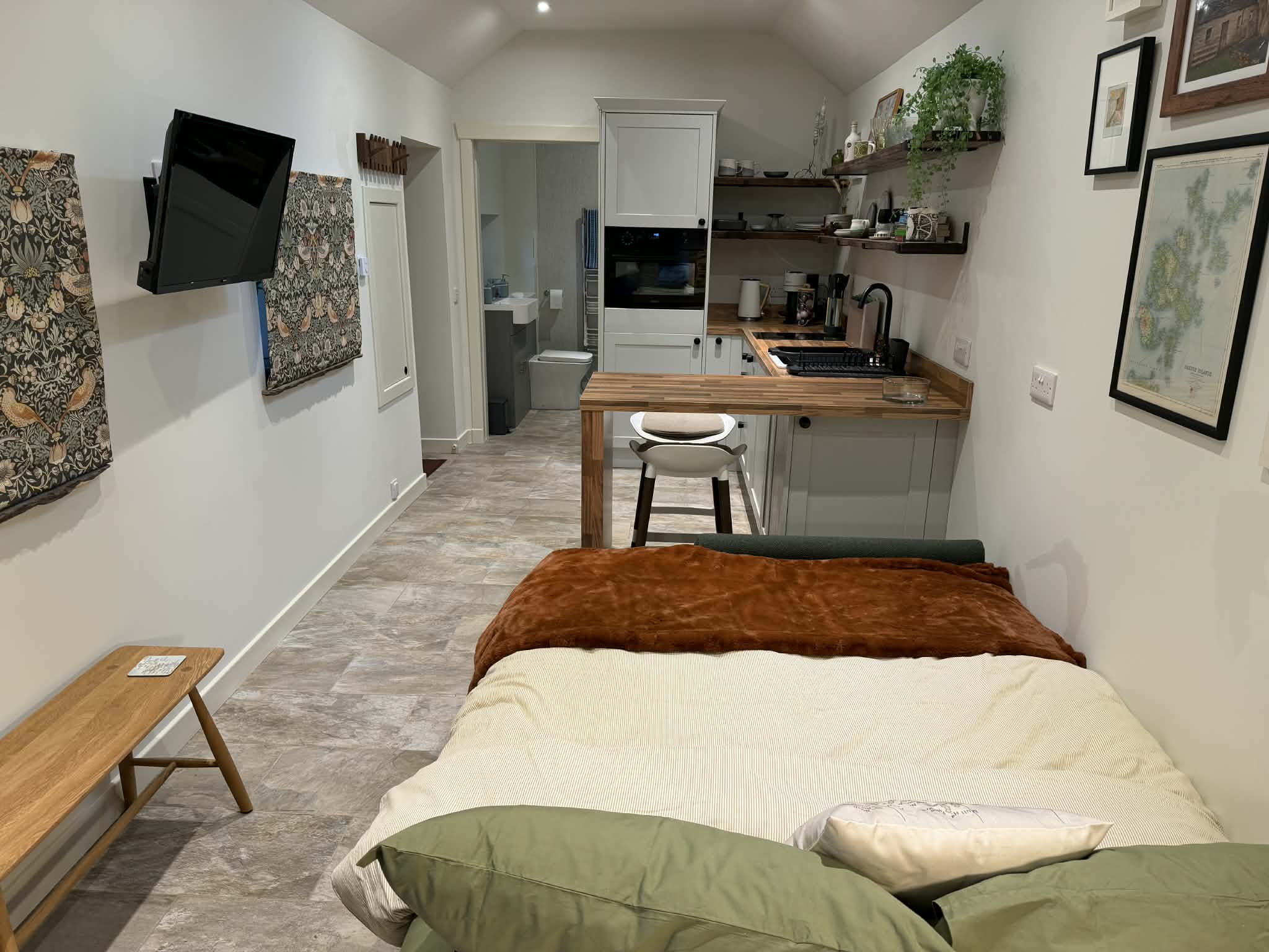 Peedie Sunnybank is an open plan studio (suitable for a maximum of two people), with an enclosed bathroom. Due to the property being very compact, the only sleeping area is a sofa bed. This is a 3-seater sofa, that folds out to be a comfortable double sized bed. Mattress topper is also provided, to ensure a comfortable night’s sleep! There is a well equipped modern kitchen, that hopefully has everything you should require for a self-catering stay.