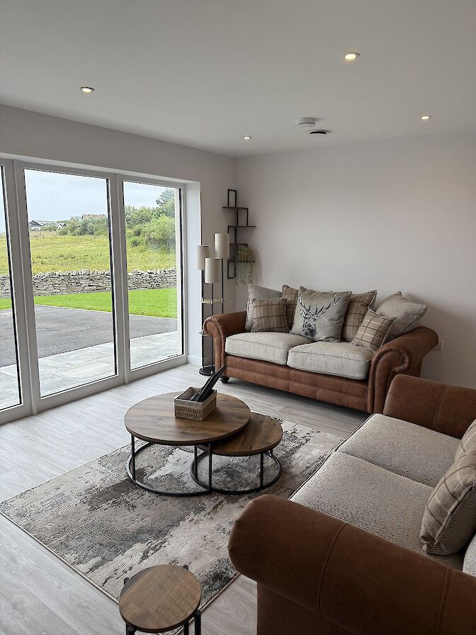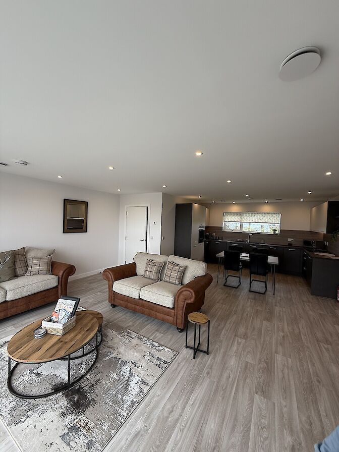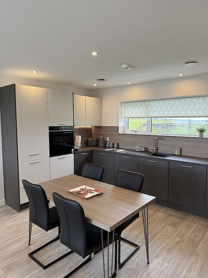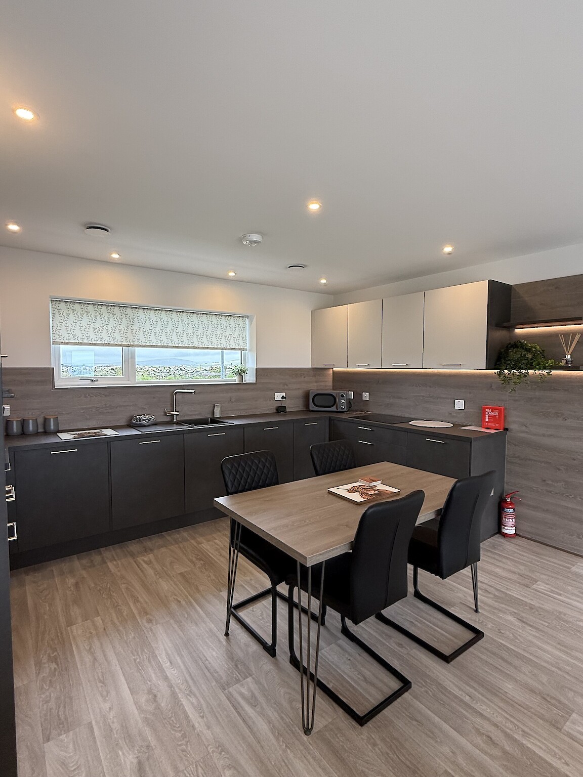 Inside the décor is fresh and welcoming. The open‑plan lounge and kitchen is bright, with big windows looking out over the Orkney islands.