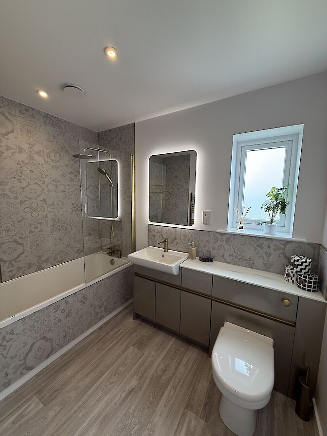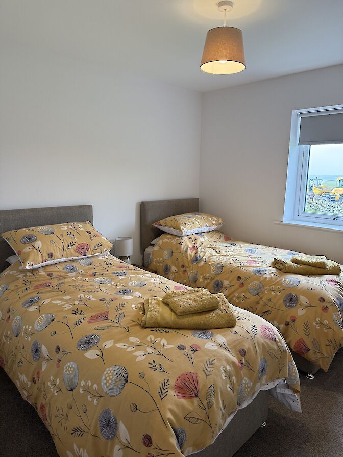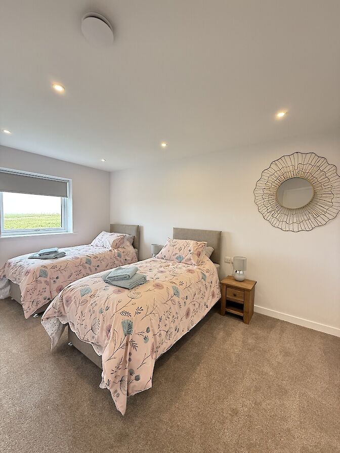 Both bedrooms are generous in size. One has a king‑size bed with crisp linen; the second can be two single beds or joined to make another king‑size bed. A modern bathroom providing plenty of space. Outside there is a private garden and parking space, a rare find so close to Kirkwall.