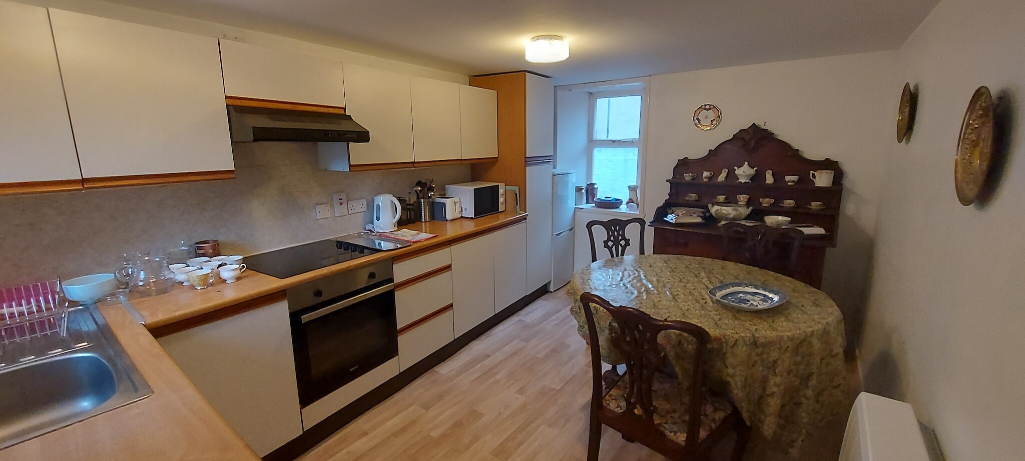 - kitchen on ground floor with electric cooker, oven, fridge-freezer, microwave, toaster, electric kettle (no dishwasher)