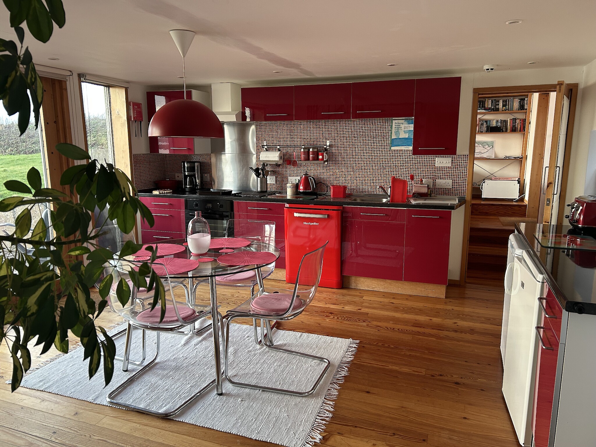 The Rousay (aka red unit) is the largest with a patio and sweeping sea views. It has two bedrooms, one double upstairs where there is a large bathroom with spa bath and shower. The bedroom downstairs has a single day bed allowing room for a low single chair bed also, therefore, suitable for two children. There is an adjoining shower wet room. The sitting room has a sofa bed.