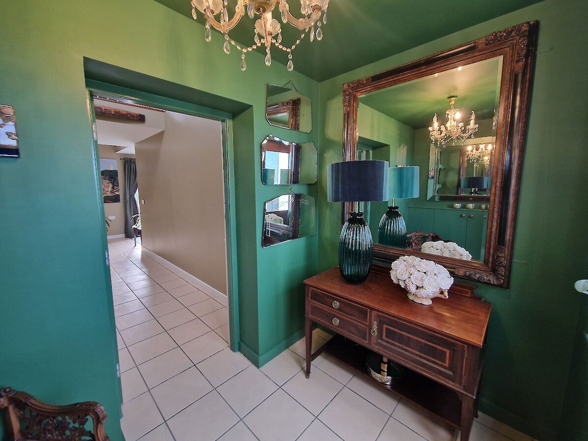 On the ground floor, you’ll find the open-plan kitchen and dining area, three spacious double bedrooms, two bathrooms and a utility room. The living room, a half bath and the master suite, complete with dressing room and full bathroom, are located on the first floor. Outside there is a large garden with uninterrupted sea views and a flagstone patio.