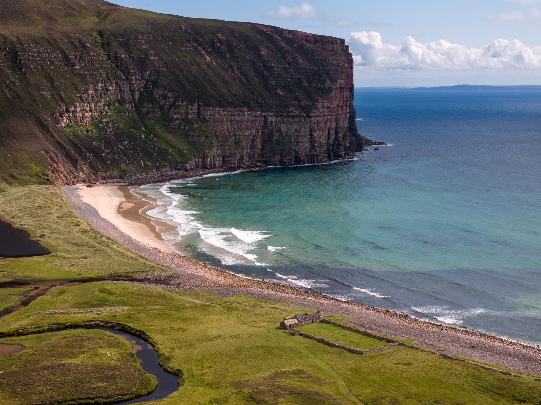 The low-lying stone croft house is backed by towering sea cliffs of red sandstone and a beach of boulders and sand, open to the Atlantic. The modest building is maintained by the Hoy Trust as a bothy, open to all and free to use (though a small donation is strongly encouraged.)