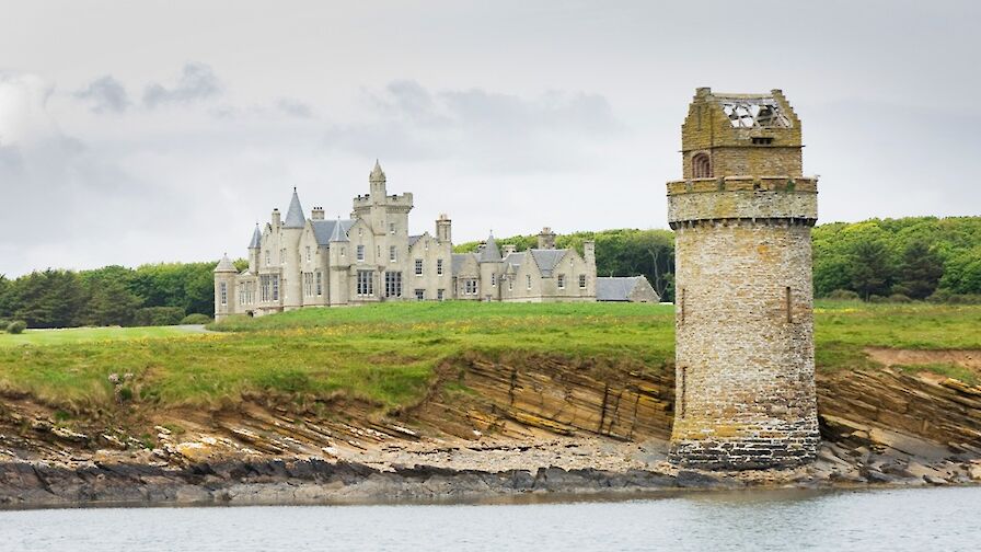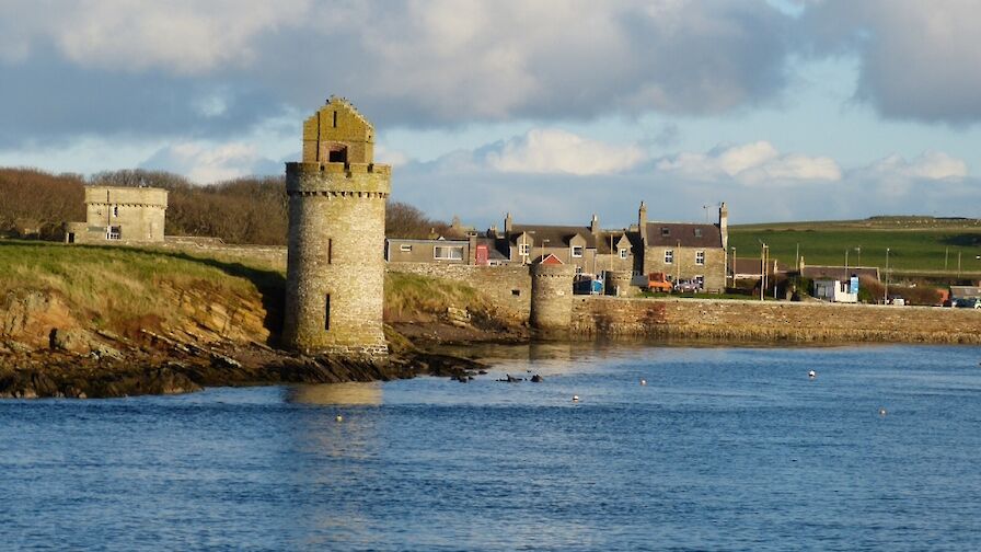 En-route you'll pass the small isles of Thieves Holm and Helliar Holm, with its Stevenson designed lighthouse, then the ferry will head into Elwick Bay, offering fantastic views of the iconic Victorian Balfour Castle and The Douche, a drystane tower built as a salt-water shower, with a dovecot on top, on the shore.