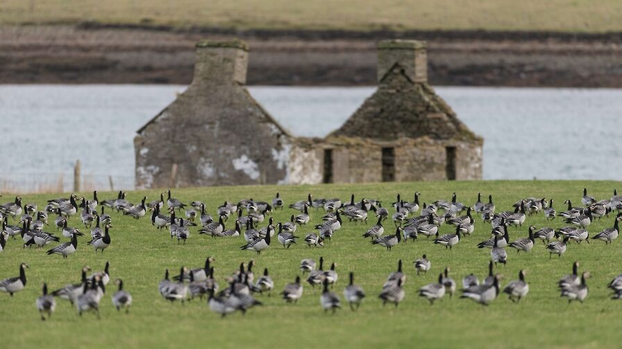 Most folk are now accustomed to seeing geese in Orkney's fields all year round with a large population of Greylags now resident here. For a real migratory treat though it's worth hopping across to Hoy on the ferry and driving down to South Walls to see the beautiful Barnacle Goose. Most of the Barnacle Geese which breed in Greenland head to Islay for the winter but around 1500 of these black and white birds feed in the fields of South Walls from late October until April. Once dusk descends they rise as one across Cantick Sound to spend the night on the safety of uninhabited Switha.