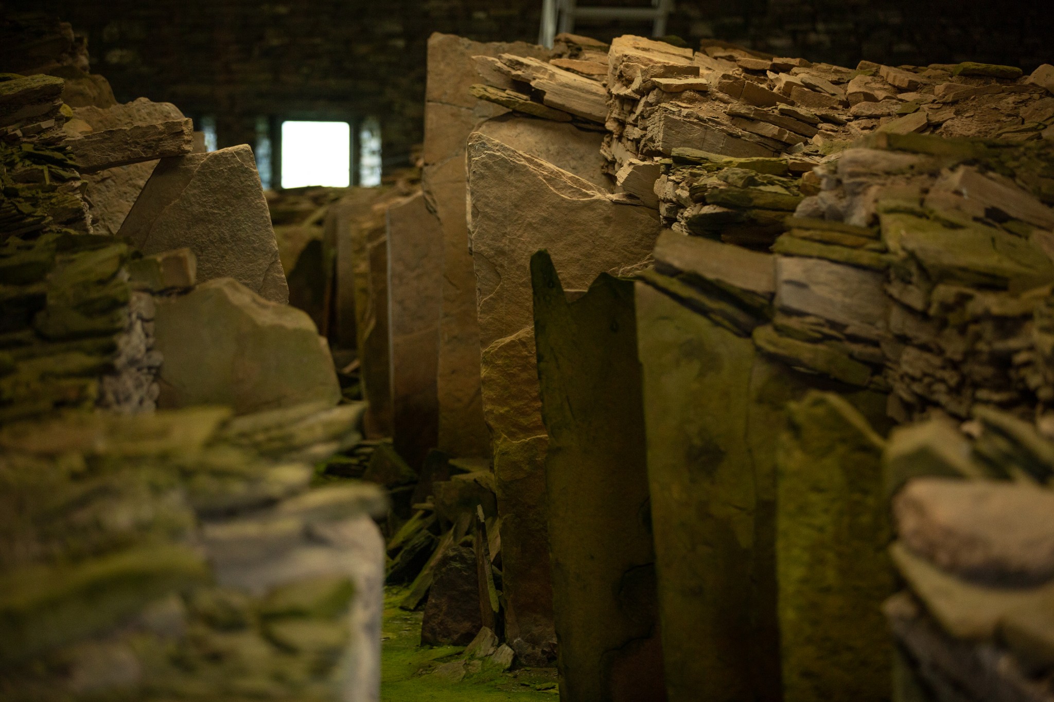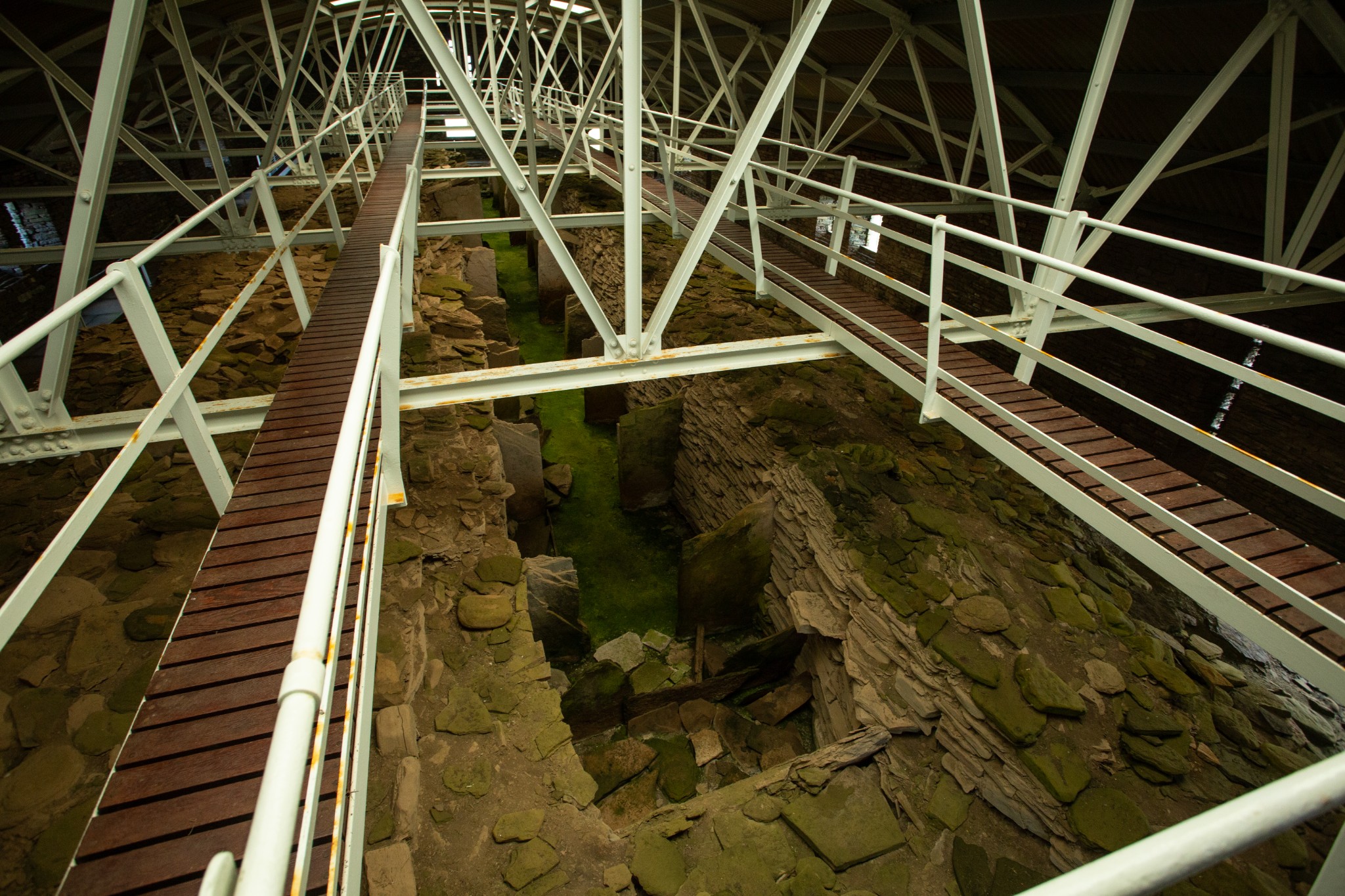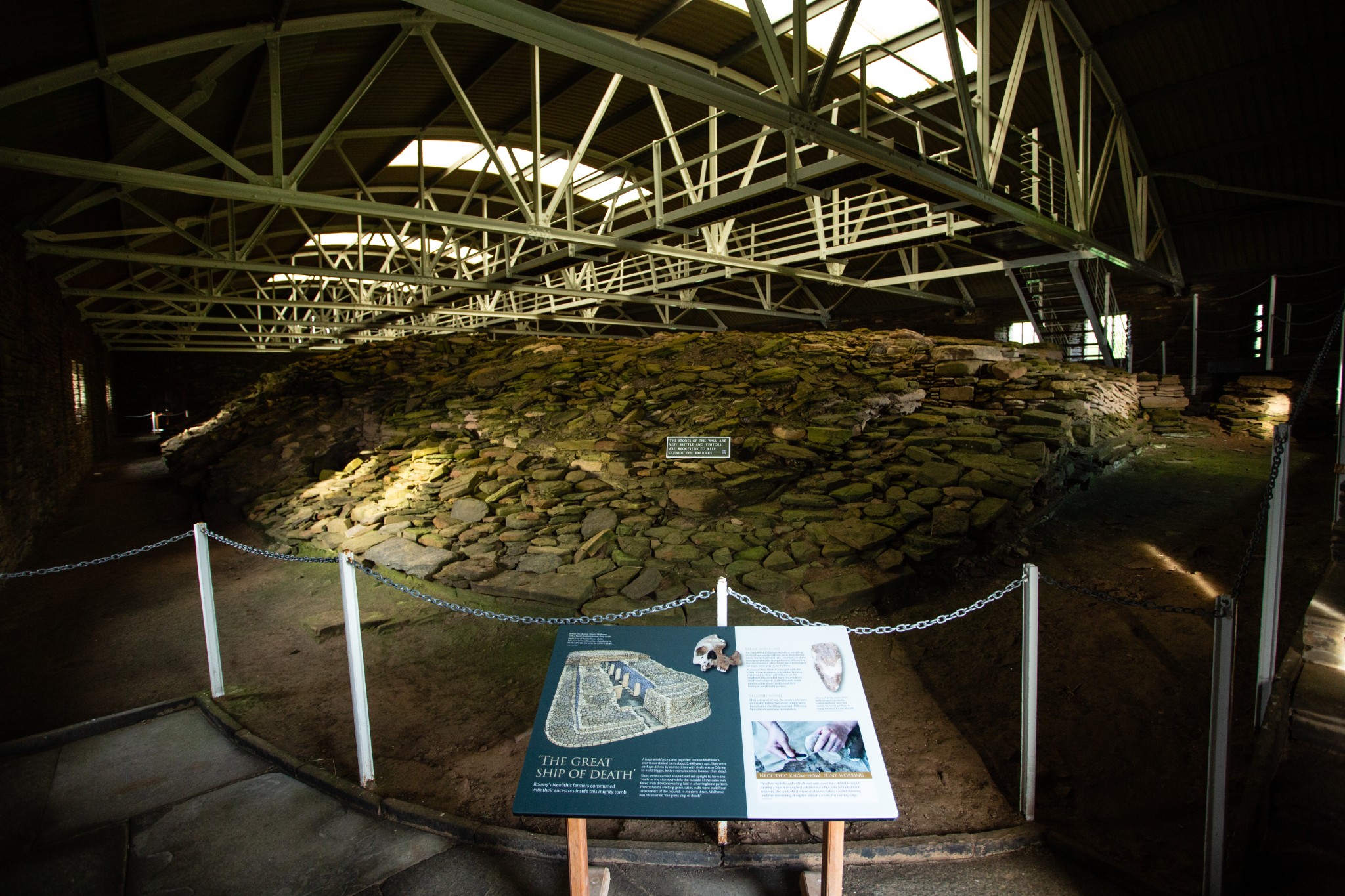 Midhowe Chambered Cairn in Rousay is nicknamed 'the Great Ship of Death' given its sheer size, and the fact the remains of at least 25 humans were found here during excavations in the 1930s. This huge site is covered by a modern hangar which offers protection, but also the chance to walk above the cairn - a truly unique experience.