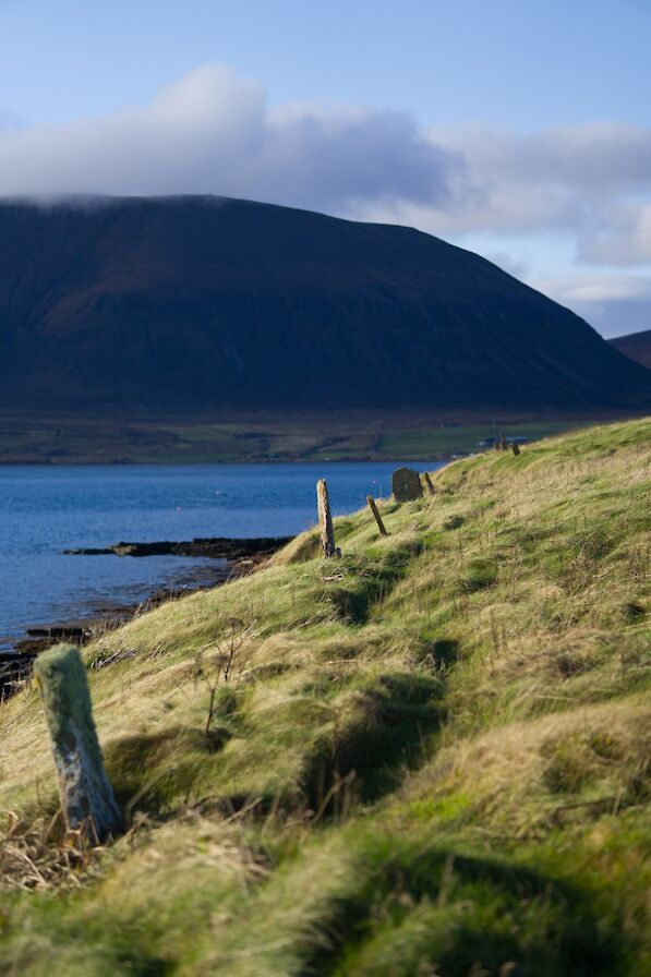 Here you’ll find one of many picnic benches which are thoughtfully provided throughout the route. It’s a fine point to stop for a break with a fabulous view across Burra Sound to the rounded peaks of Ward Hill and Cuilags in Hoy.