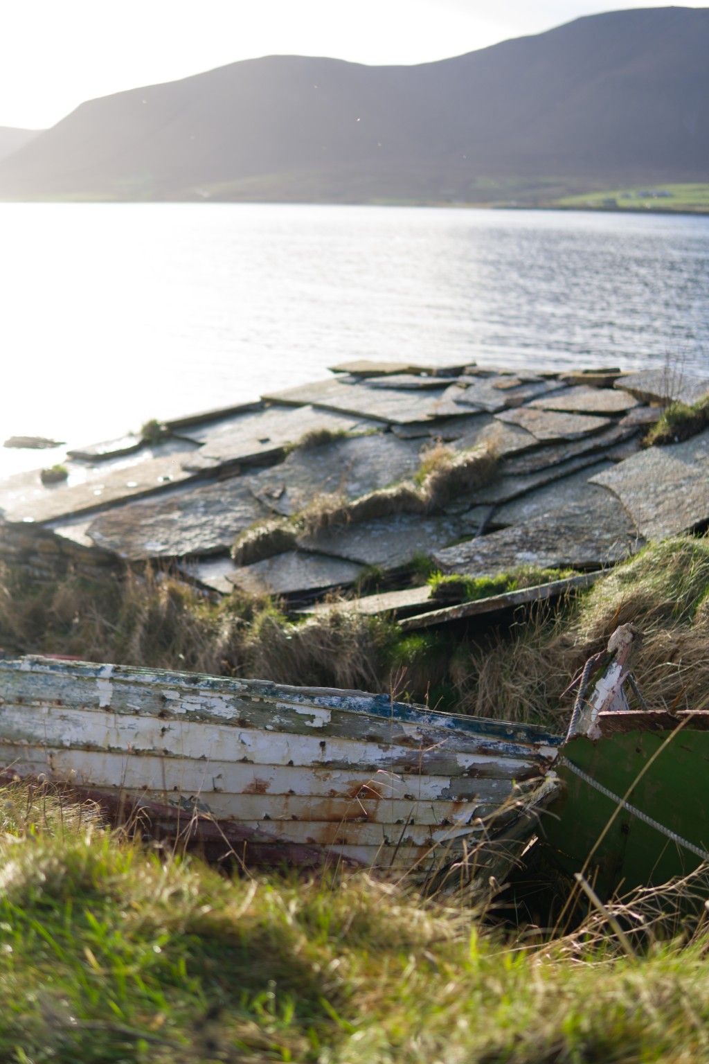 A further 800m along the coast you come to another noust at Skeafea, where one last yole is gently rotting into its noust. Following the coast, the route gradually begins to turn north. Just beyond the headland of Hestor is Bride’s Noust, supposedly the site of a 12th century chapel and graveyard. Nothing remains of the structure now, though much of the stone may have been reused in the construction of more recent buildings, the footings of which can still be seen.