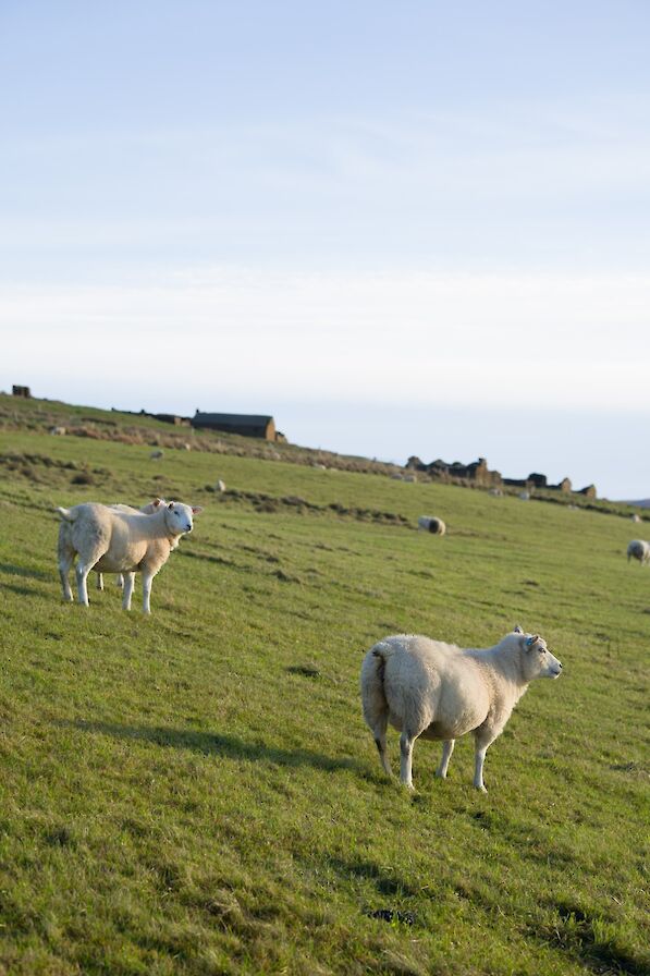 The route now heads southeast, easy going at first over closely cropped coastal heath. Some care is required at one point where the track has subsided a little. After around 1km, as the route curves around to the south, look for a track heading inland just before you reach the croft of Quoys. Follow this track for 200m before reaching the public road.