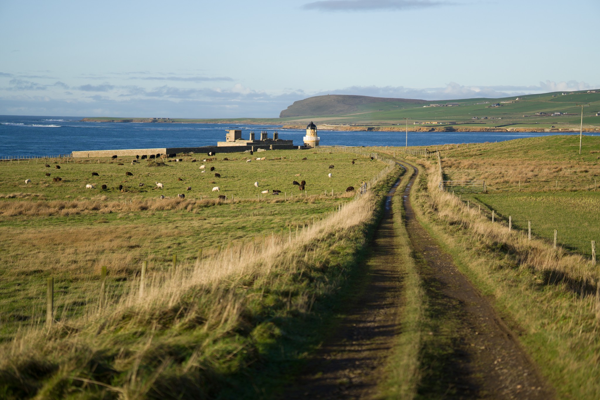 As the road takes a sharp right, turn instead to your left to follow a vehicular track towards the obvious lighthouse of Hoy Low. After 500m look for a wide grassy track on your left heading directly towards the shore. On reaching the shore turn right to follow the coast to reach the lighthouse and the gun emplacements which formed part of the impressive defences which guarded the approaches to the vital naval anchorage of Scapa Flow.