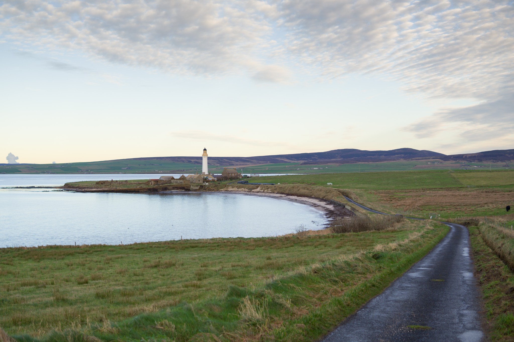 On reaching the road turn left, passing the island’s tiny community centre. The picturesque Bay of Sandside is on your left. Either follow the road or walk along the beach to reach the large house of Sandside where the road turns right. The fine lighthouse of Hoy High can be admired from the road but do keep in mind that both the island’s lighthouses are private residences and keep a respectful distance.